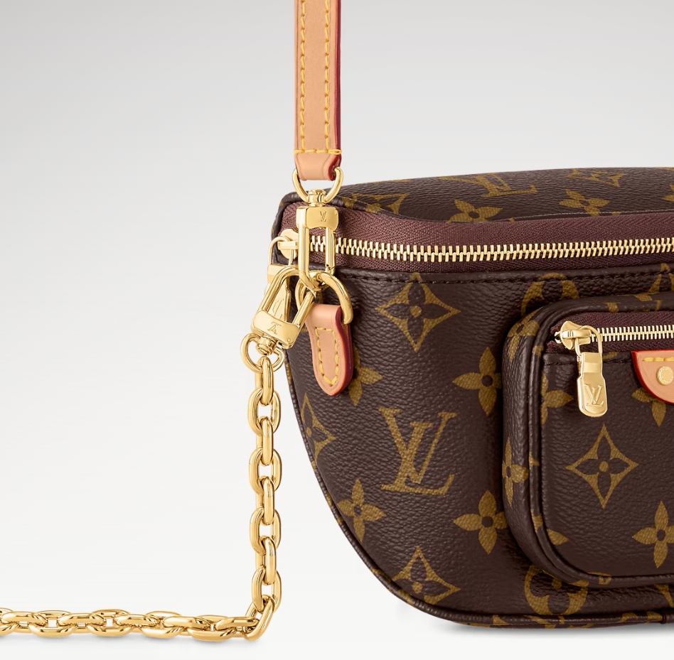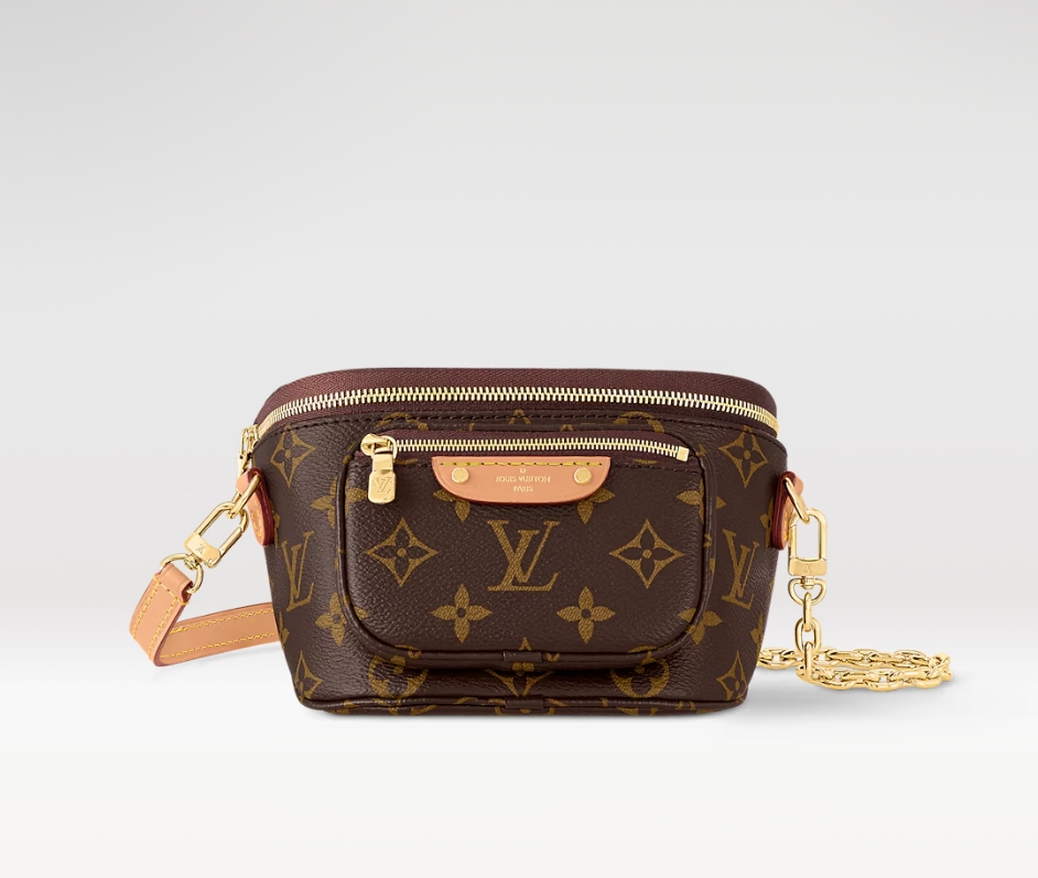 トレンディな「バムバッグ」のフォルムを、モノグラム・キャンバスを使用してルイ・ヴィトンならではのフェミニンな雰囲気に再解釈した「ミニ バムバッグ」。メゾンを象徴するヌメ革で仕立てた取外し & 調節可能なストラップと、機能性と装飾性を兼ね備えた取外し可能なゴールドカラーのチェーン付きで、さまざまな持ち方をお楽しみいただけます。ファスナー開閉式のメインコンパートメントと、エンボス加工を施したレザータグを添えたファスナー付きのフロントポケットも魅力です。