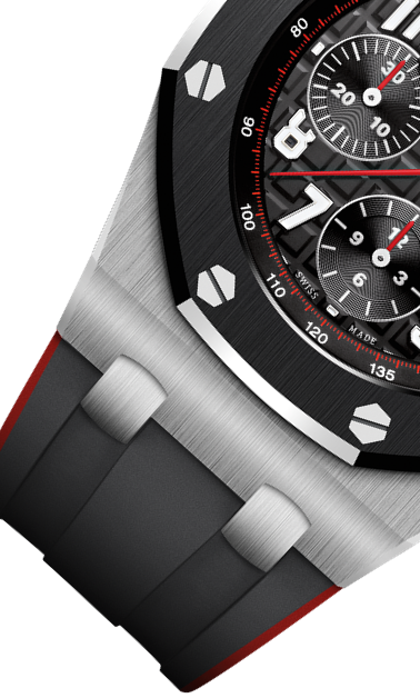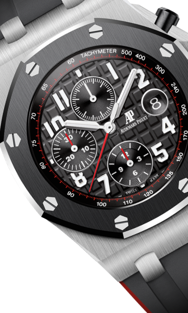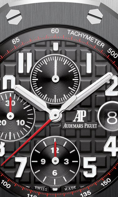 文字盤:「グランド・タペストリー」模様のシルバーダイヤル、ブラックのカウンターとインナーベゼル、ホワイトゴールド製アプライドアワーマーカーと蓄光処理を施したロイヤルオーク針。