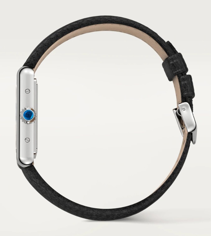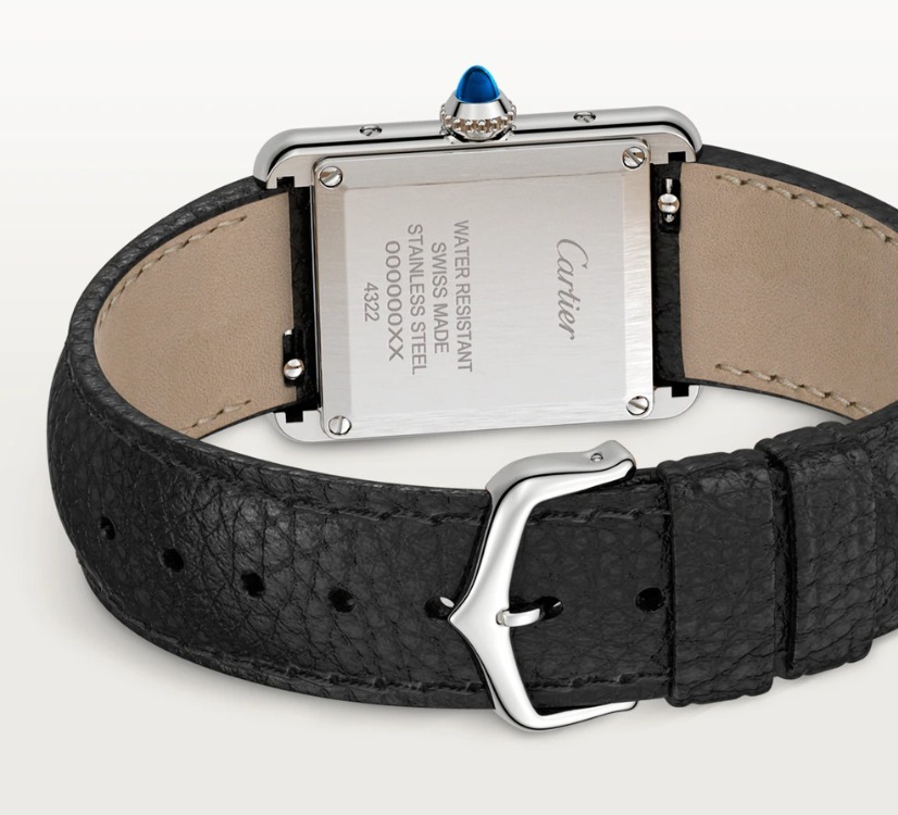 【サイズ・仕様】タンク マスト ウォッチ、SM、クォーツムーブメント。スティール製ケース、パール状の飾り付きリューズにカボションシェイプ シンセティック スピネル、シルバーダイアル、ブルースティール製剣型針、グレイン仕上げブラックカーフスキンストラップ、スティール製アルディロンバックル。ケースサイズ:29.5 mm x 22 mm厚さ:6.6 mm。日常生活防水。