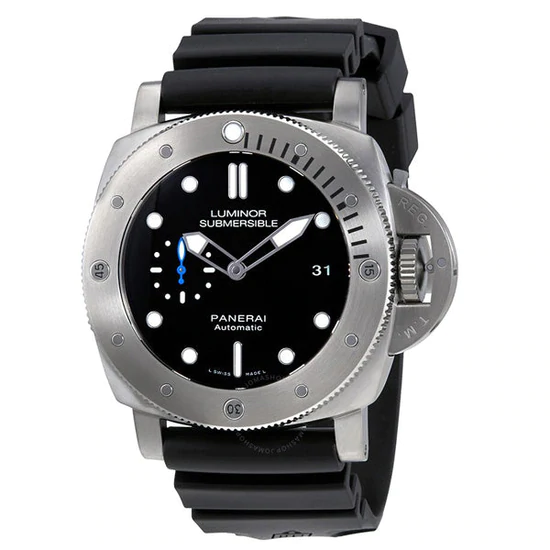 ムーブメント&仕様ケース素材サテンチタンベルト素材カウッチュー、ブラック、26/22 MM スタンダード文字盤色ブラックケースサイズ47mm防水300m機械自動巻き自社製キャリバー P.9010その他特徴パワーリザーブ3日間グリュシデュール(R)製テンプ振動数:28.800回/時インカブロック(R)耐震機構機能:時、分、スモールセコンド、日付ベゼル:エッジ部分がポリッシュ仕上げのサテンチタン目盛りの付いた反時計回り逆回転防止ベゼルケースバック:チタン、ねじ込み式リュウズプロテクター:(パネライ特許)サテンチタン文字盤:夜光アワーインデックスとドット。3時位置に日付、9時位置にスモールセコンド