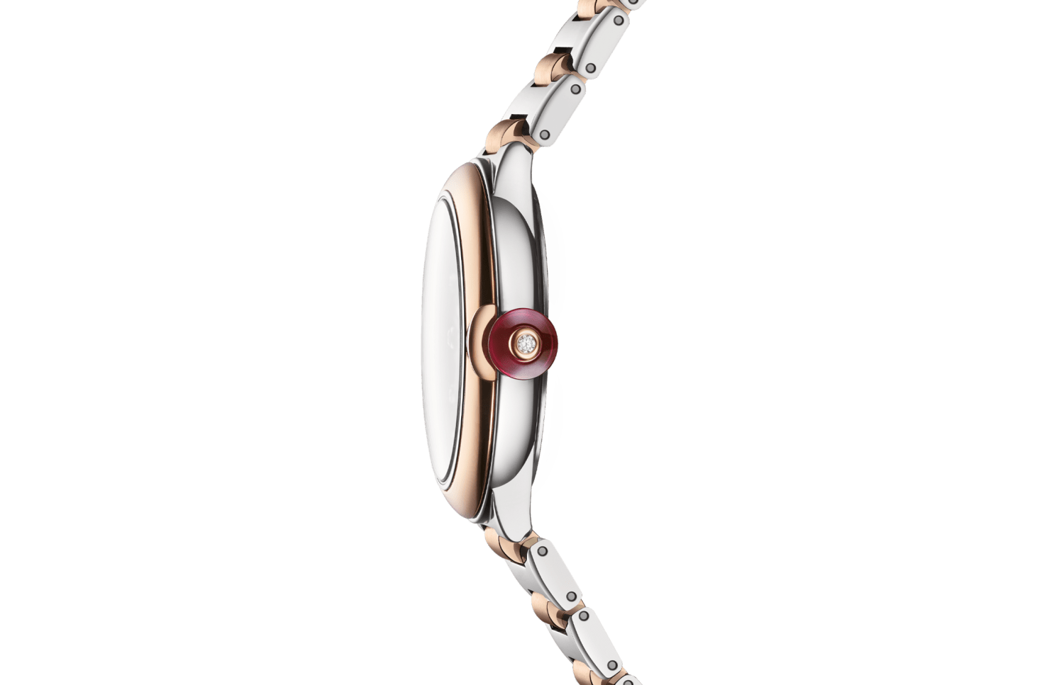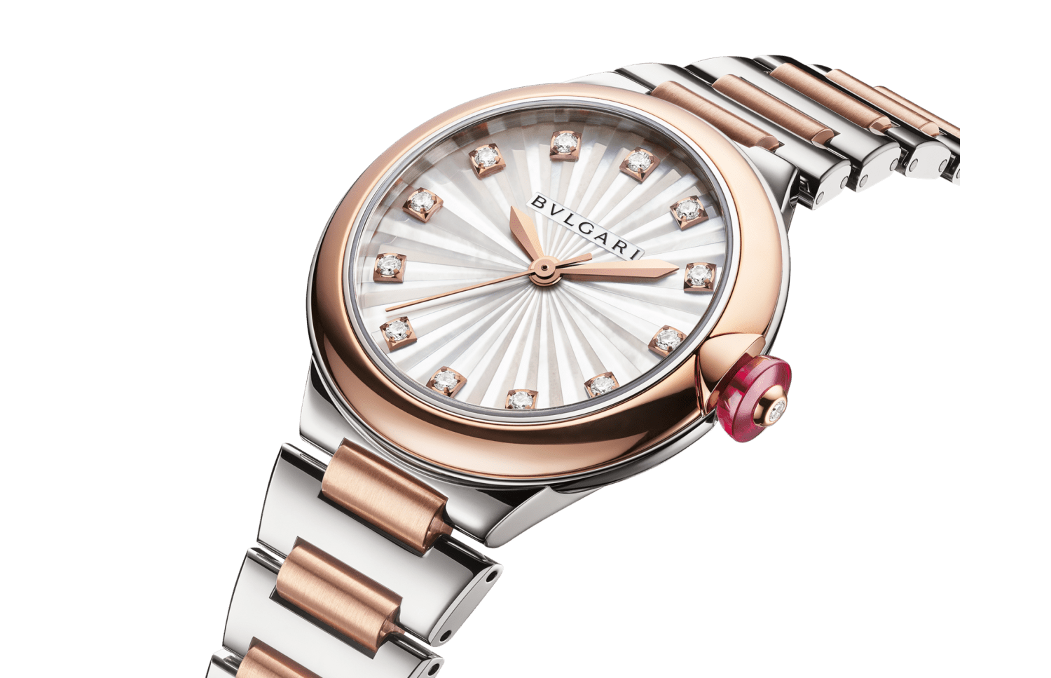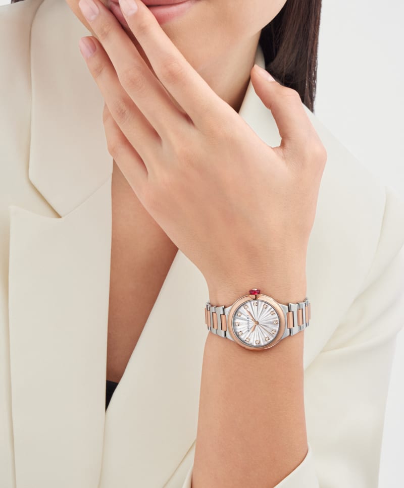 輝きと現代的な女性らしさのシンボル、ルチェア ウォッチ。日々それぞれのスタイルに魅力を添えます。 18Kピンクゴールドとポリッシュド&サテンブラッシュド ステンレススティール製のこのタイムピースでは、ブルガリが有するジュエリーのサヴォアフェールと時計製造専門技術が融合し、卓越した芸術性が息づきます。 「インタルシオ(透かし彫り)」に着想を得た伝統的なメティエダール技法を使い、ホワイトマザー・オブ・パールのパーツに一つひとつファセットを施し、太陽の光をイメージして貼り合わせた立体的なダイアルには、ダイヤモンドのインデックスが光り輝きます。ルチェア ウォッチ。自動巻ムーブメント。時・分・日付表示。33mmのポリッシュドステンレススティール製ケース。18Kピンクゴールド製ベゼル。ホワイトのマザー・オブ・パール製インタルシオ マルケトリのダイアル。12個のラウンドブリリアントカット・ダイヤモンドのインデックス。ステンレススティール製リューズにカボションカットのシンセティックピンクサファイアとダイヤモンド1個。18Kピンクゴールドとポリッシュド&サテンブラッシュドステンレススティール製ブレスレット。フォールディングバックル。 50メートル防水。