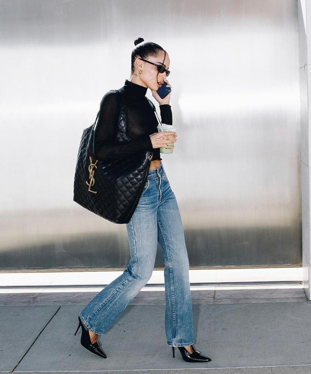 女優のゾーイは、黒のタートルクロップドトップスとデニムパンツのコーデを、イカールとボウパンプスでラグジュアリーにクラスアップ。