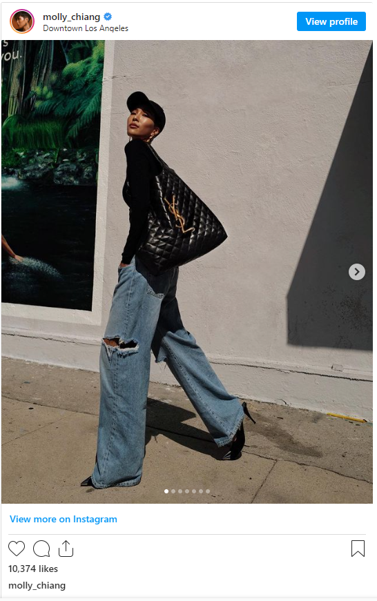 インフルエンサーのモリーは、黒のダメージトップスとワイドデニムパンツのコーデを、イカールとヴェスパーパンプスでラグジュアリーに仕上げています。