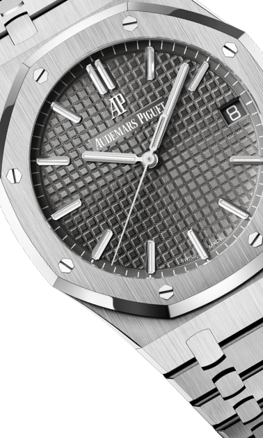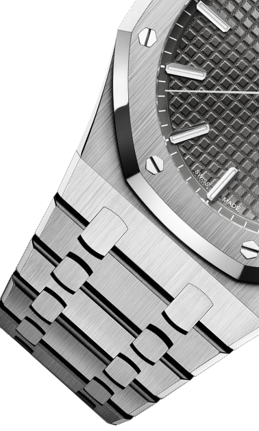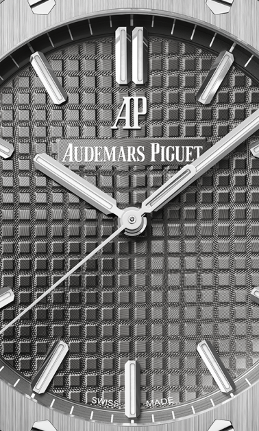 文字盤:「グランド・タペストリー」模様のシルバーダイヤル、ブラックのカウンターとインナーベゼル、ホワイトゴールド製アプライドアワーマーカーと蓄光処理を施したロイヤルオーク針。