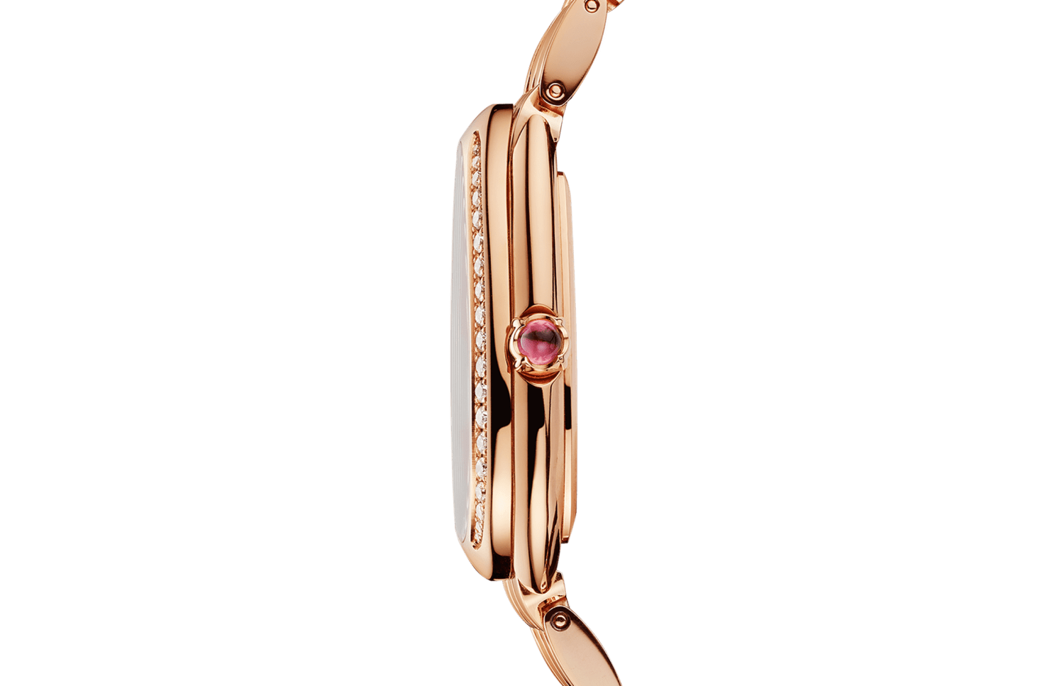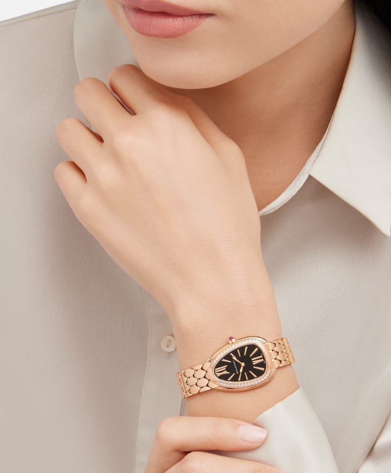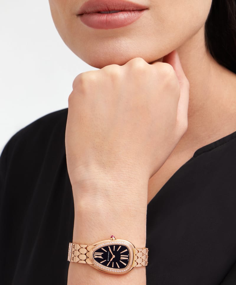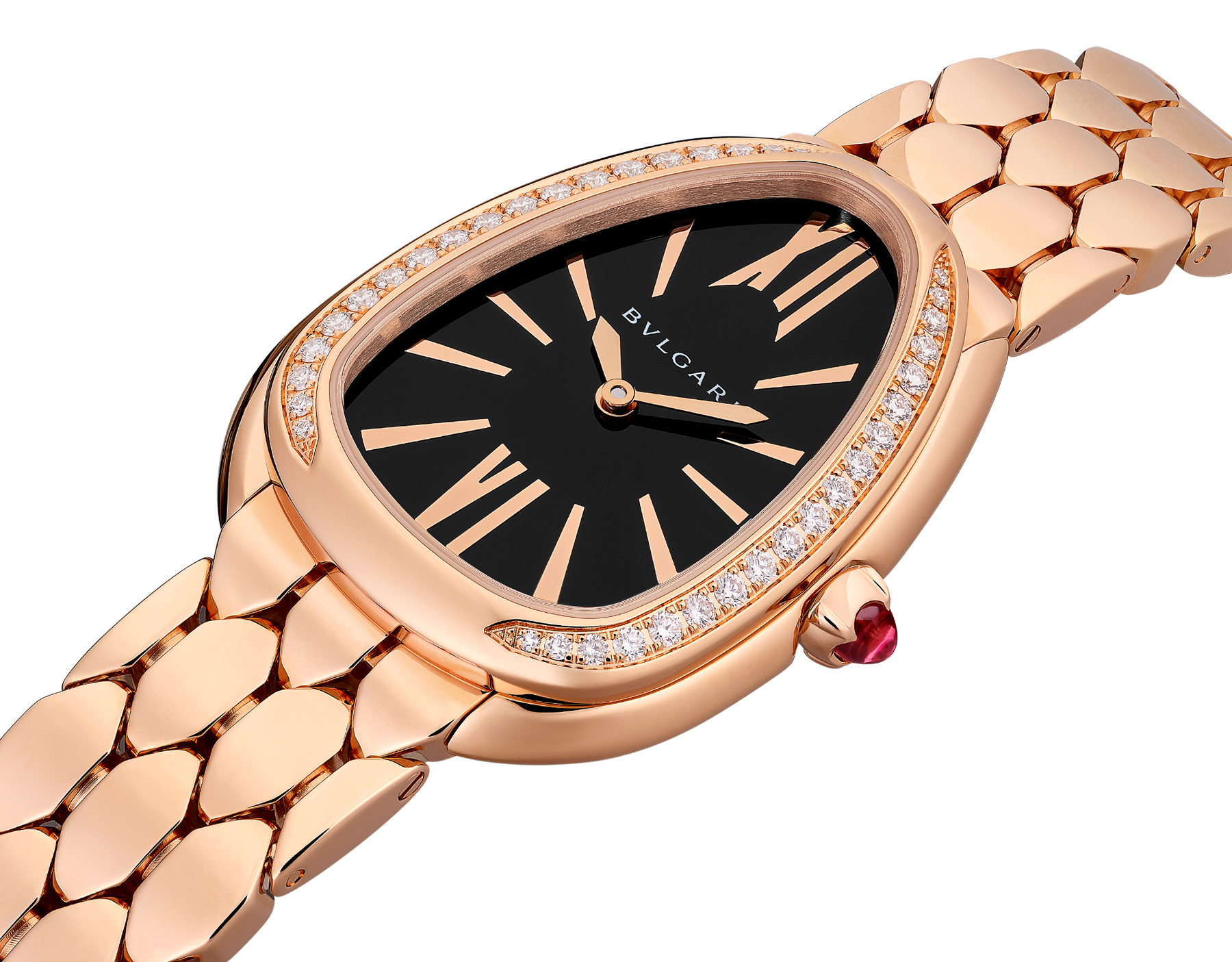 素材の洗練された輝きに満ちあふれるこのセルペンティ セドゥットーリ ウォッチは、あなたの時間をさらにプレシャスなものへと変えるでしょう。18Kピンクゴールド製。 紛うことなきブルガリの魅惑的なアイコンを、これまでにない新しいデザインで再解釈したタイムピース。ダイヤモンドをあしらった独特なドロップシェイプのウォッチヘッドとブラックラッカーのダイアルが特徴的です。 官能的なしなやかさをまとうブレスレットは、ヘビのうろこに想を得たヘキサゴナルパターンを描き、華やかなジュエリーのように魅惑的な美しさを放ちます。セルペンティ セドゥットーリ ウォッチ。クオーツムーブメント。33 mmの18Kピンクゴールド製ケース。38個のラウンドブリリアントカット・ダイヤモンドを配した18Kピンクゴールド製ベゼル。18Kピンクゴールド製リューズにカボションカットのピンクルベライト。ブラックラッカーのダイアル。18Kピンクゴールド製ブレスレットとフォールディングバックル。 30メートル防水。