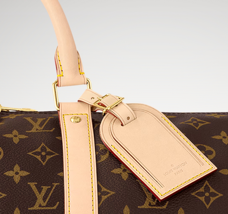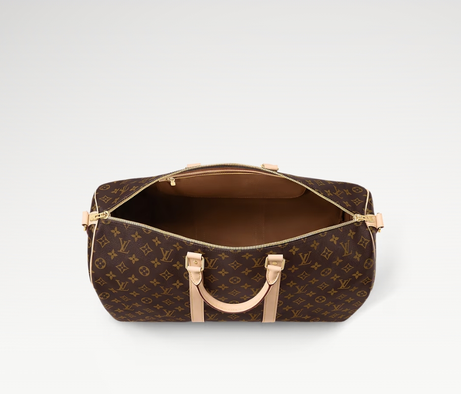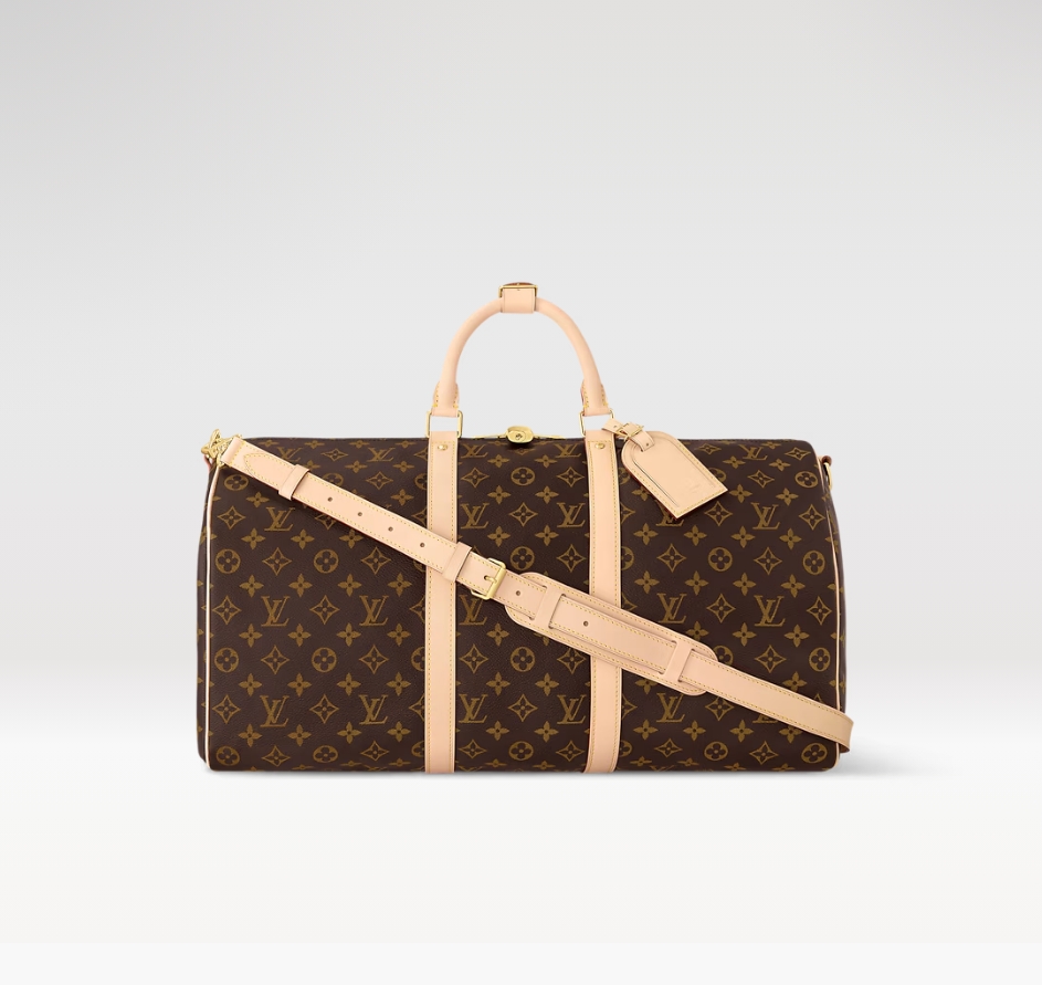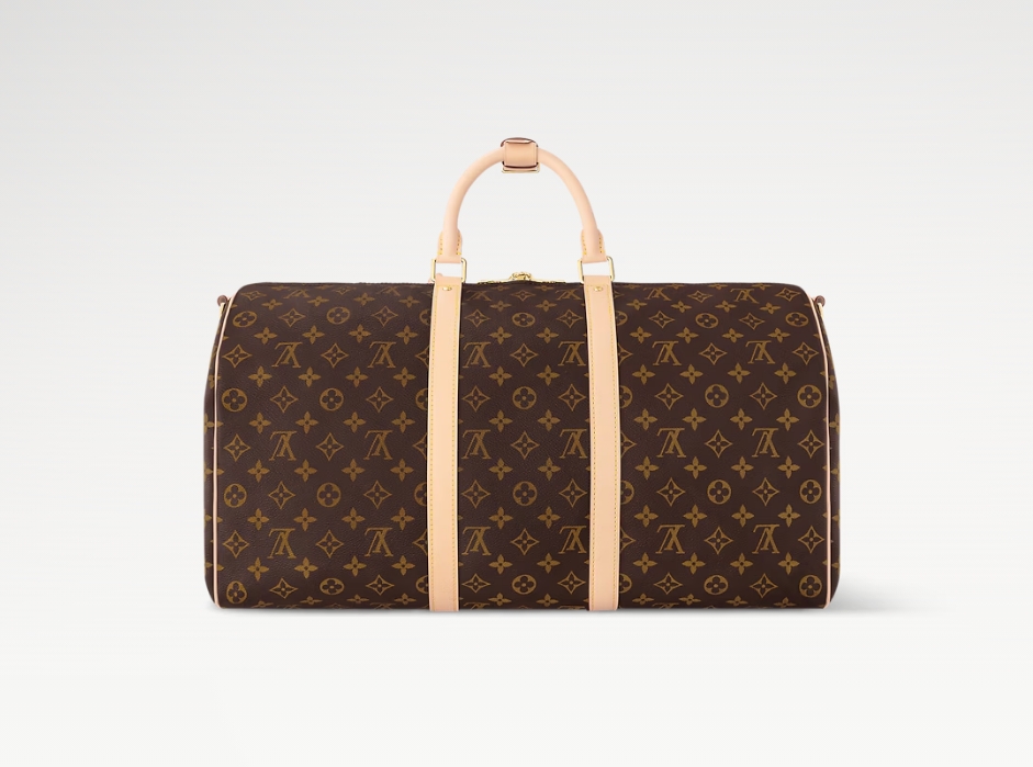ルイ・ヴィトン定番の旅行用バッグ「キーポル・バンドリエール 50」。肩に掛けて快適に持ち運べるレザーストラップ付きです。