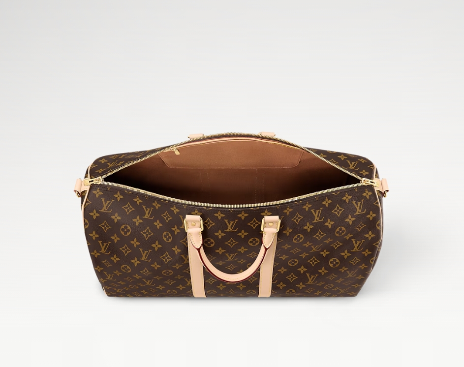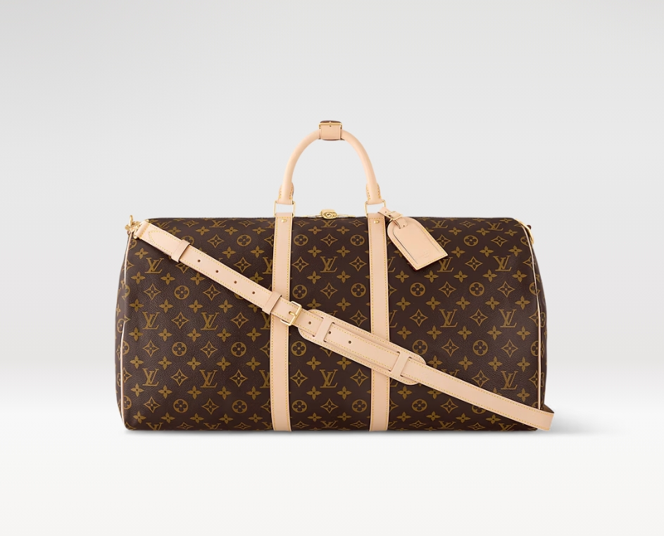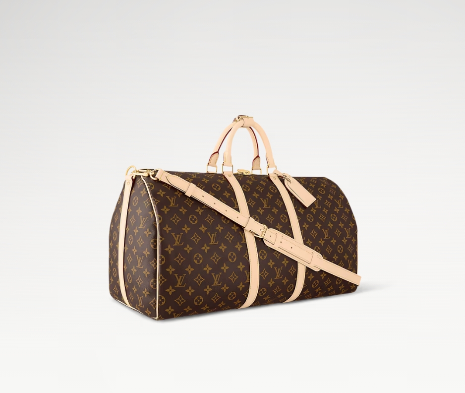 ルイ・ヴィトン定番の旅行用バッグ「キーポル・バンドリエール 55」。肩に掛けて快適に持ち運べるレザーストラップ付きです。