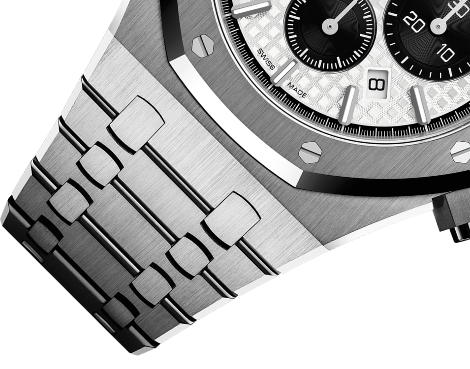 ロイヤル オークの力強く特徴的なステンレススティールケースや八角形のベゼル、一体化したブレスレットが、9時位置と3時位置に大きくなったブラックのクロノグラフカウンターを配置したシルバーカラーの「グランド・タペストリー」模様の先進的なコンビダイヤルと調和したモデルです。