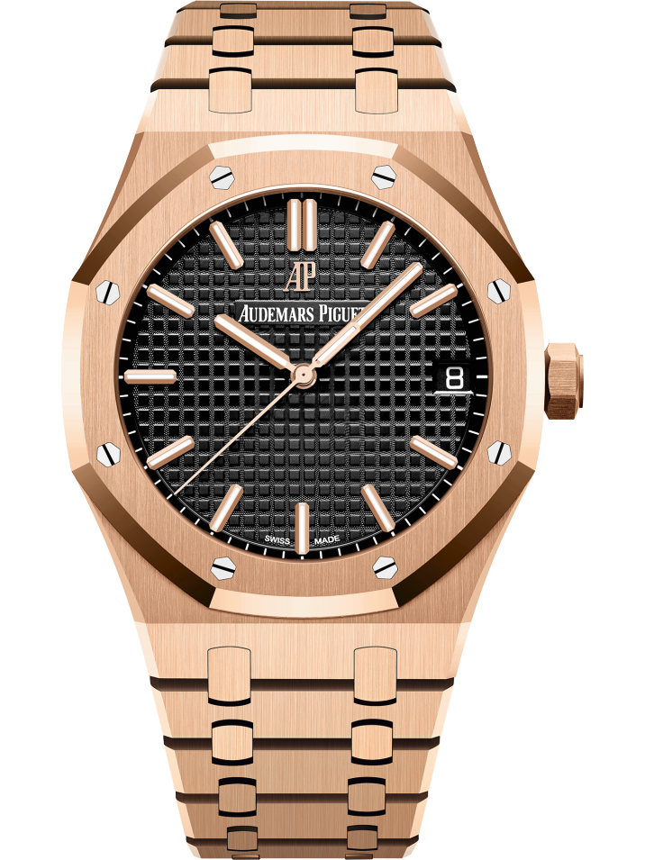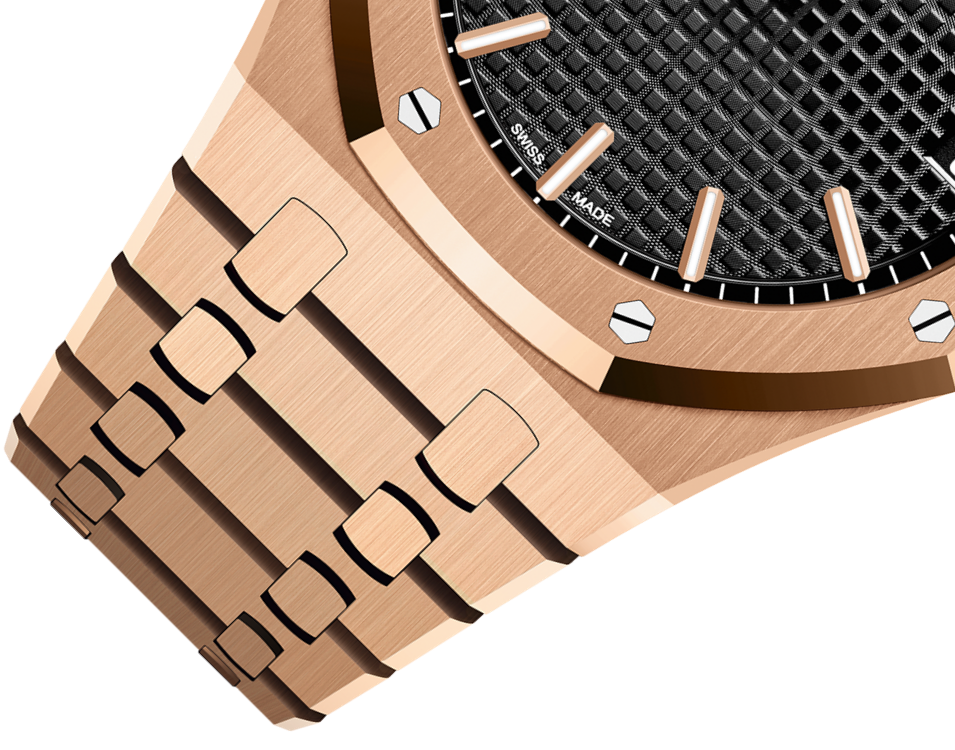 ピンクゴールド製ロイヤル オーク・オートマティックの文字盤に施された創意に富んだ新しいディテールは、幅広のインデックス、外周縁にプリントしたミニッツトラック、時計中央から離れた位置にある日付表示窓です。