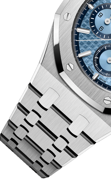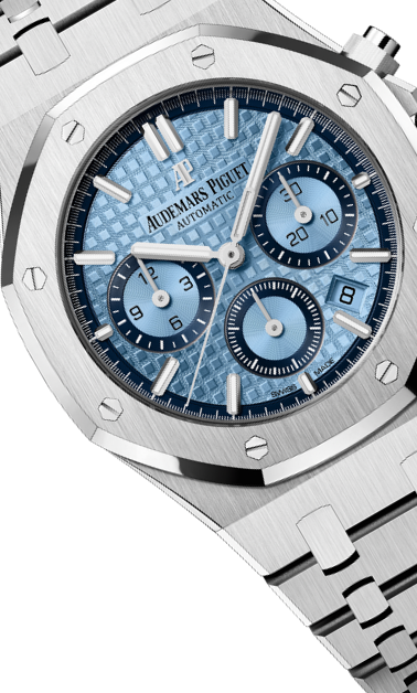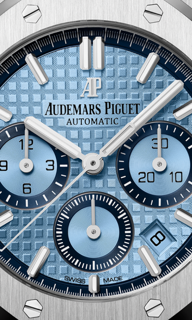 文字盤:「グランド・タペストリー」模様のシルバーダイヤル、ブラックのカウンターとインナーベゼル、ホワイトゴールド製アプライドアワーマーカーと蓄光処理を施したロイヤルオーク針。