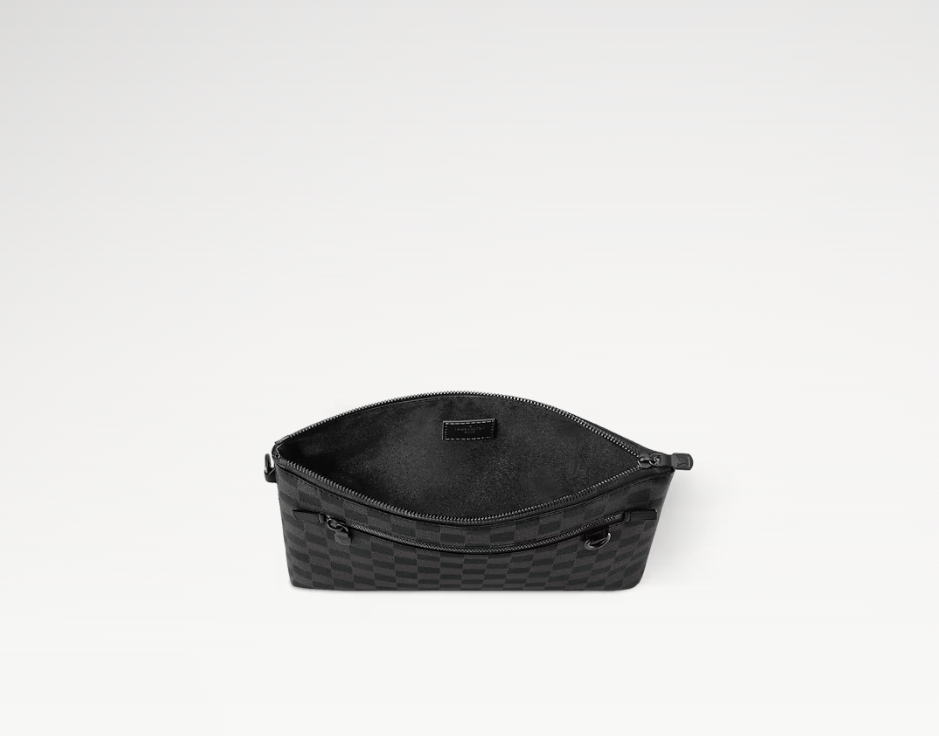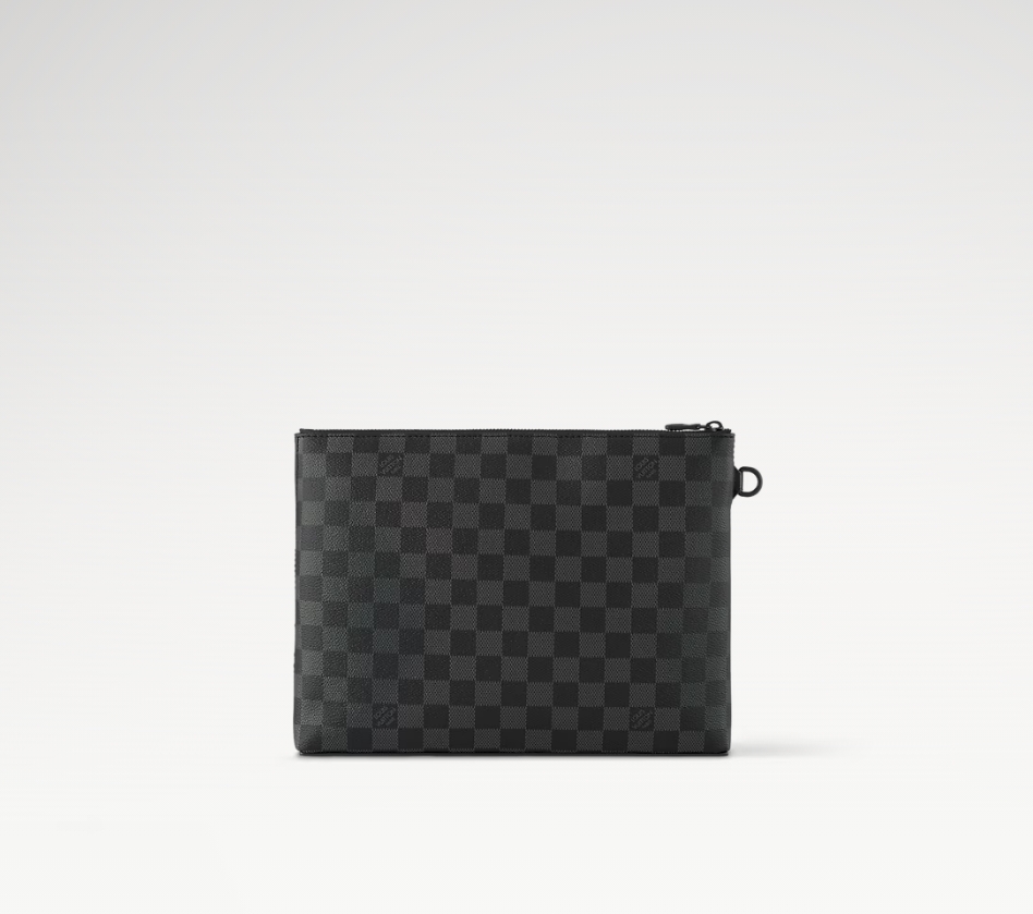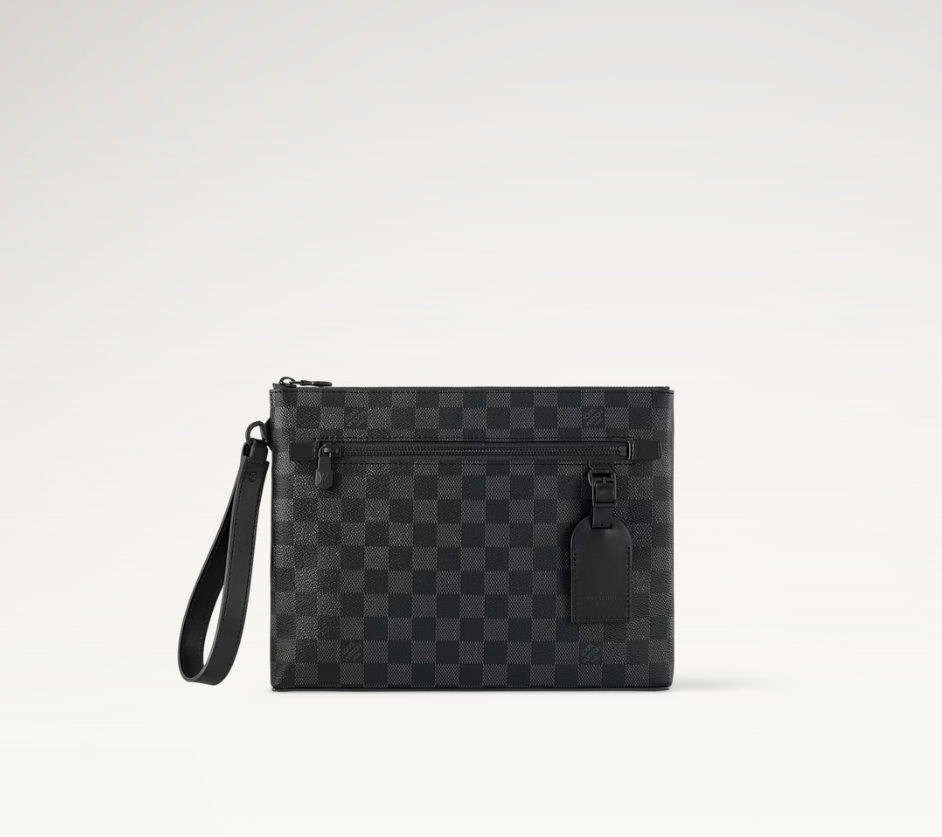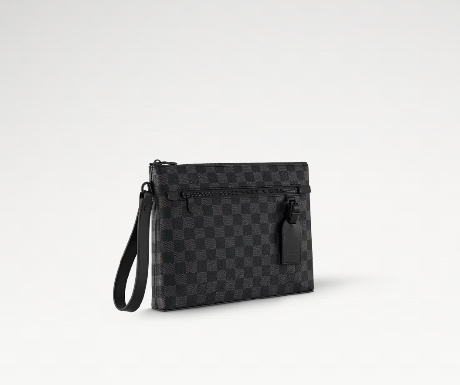 メゾンのアイコニックなダミエ・グラフィット キャンバスで仕立てた「テイクオフ・ポーチ」。従来のビジネスバッグに代わる、コンパクトなアイテムです。メインコンパートメントはiPadを収納できるサイズに仕上げ、ファスナー付きフロントポケットを配して必需品の出し入れを容易にしました。しなやかで軽量なポーチはストラップ付きで、リストキャリーでもお楽しみいただけます。