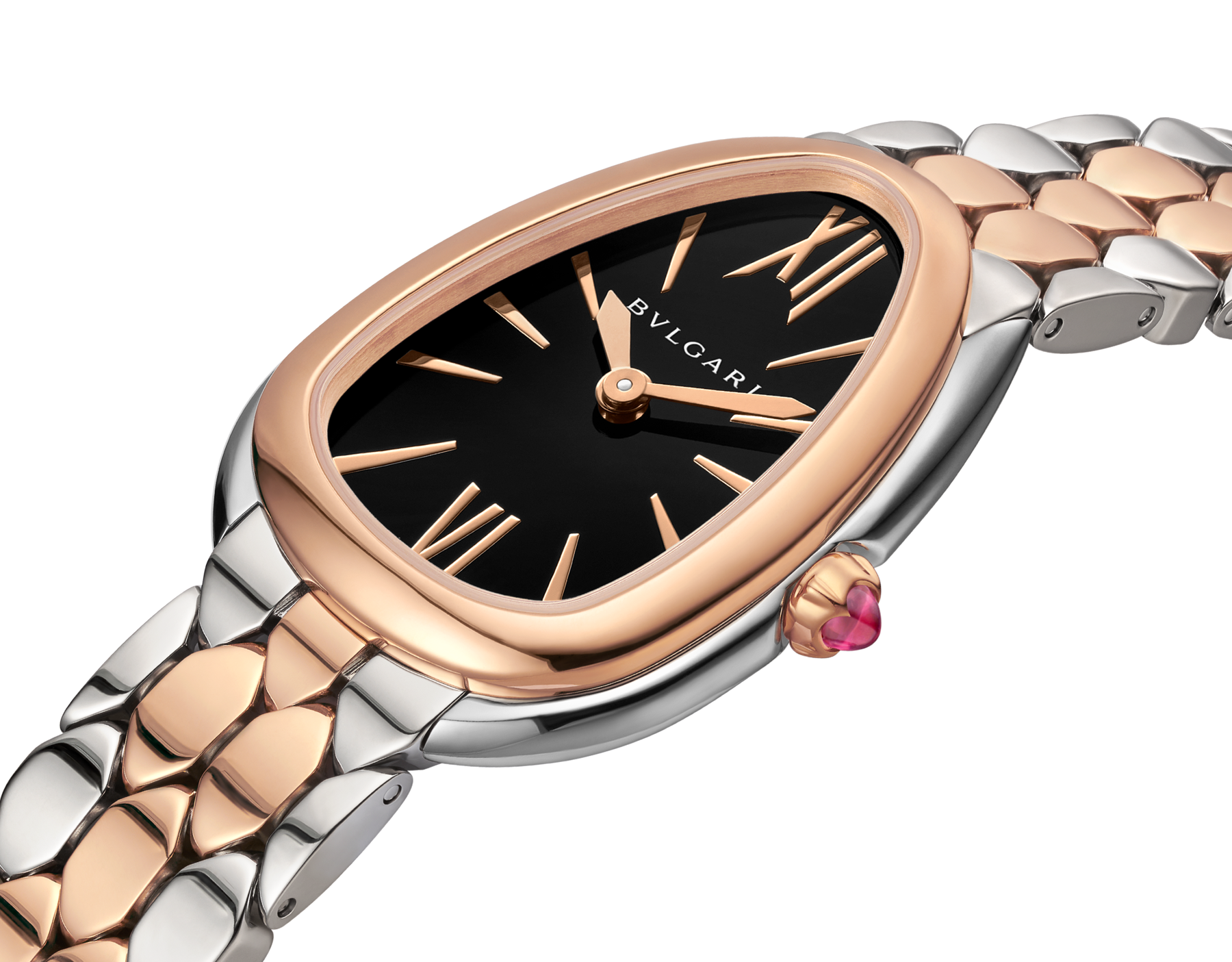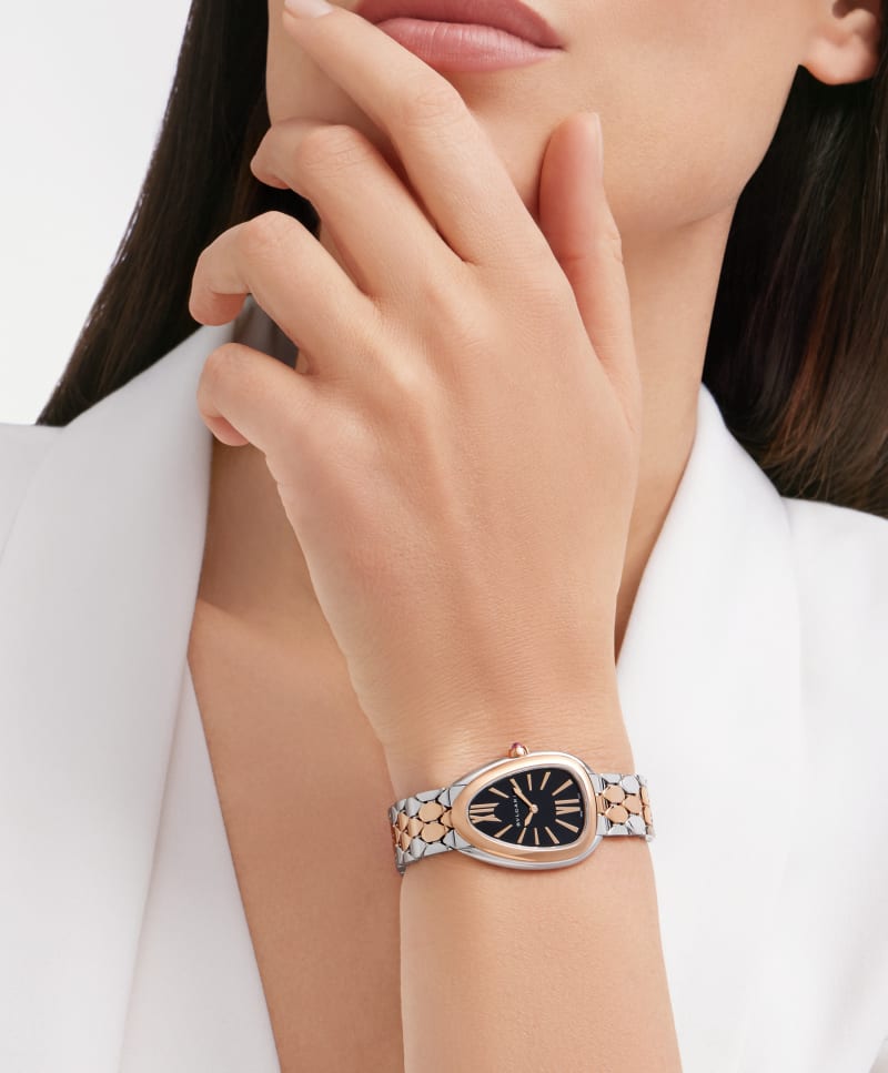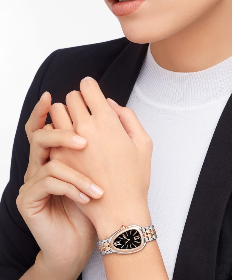 素材の放つ端正な輝きが魅力のセルペンティ セドゥットーリ ウォッチ。18Kピンクゴールド製。抗いがたいミステリアスな官能性とコンテンポラリーな魅力を見事にブレンドしています。 ブラックのラッカー仕上げのダイアルを配した個性的なドロップ型のウォッチ。魅惑的なコントラストが特徴です。 ヘビのうろこにインスパイアされた、ヘキサゴナルパターンをあしらった手首にしなやかに沿うブレスレットが、ジュエリーとウォッチメイキングの世界を完璧につないでいます。 セルペンティ セドゥットーリ ウォッチ。クオーツムーブメント。33 mmのステンレススティール製ケース。18Kピンクゴールド製ベゼル。18Kピンクゴールド製リューズにカボションカットのピンク・ルベライト。ブラックラッカーのダイアル。ステンレススティールおよび18Kピンクゴールド製ブレスレットとフォールディングバックル。 30メートル防水。