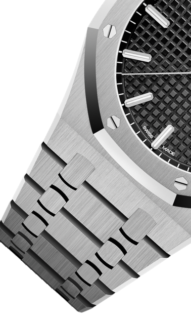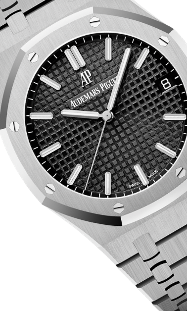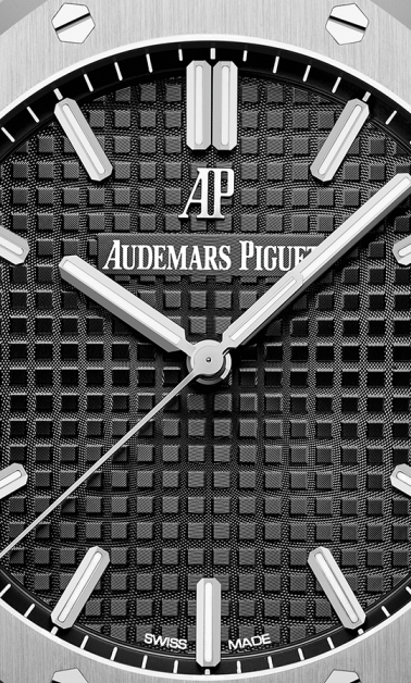 文字盤:「グランド・タペストリー」模様のシルバーダイヤル、ブラックのカウンターとインナーベゼル、ホワイトゴールド製アプライドアワーマーカーと蓄光処理を施したロイヤルオーク針。