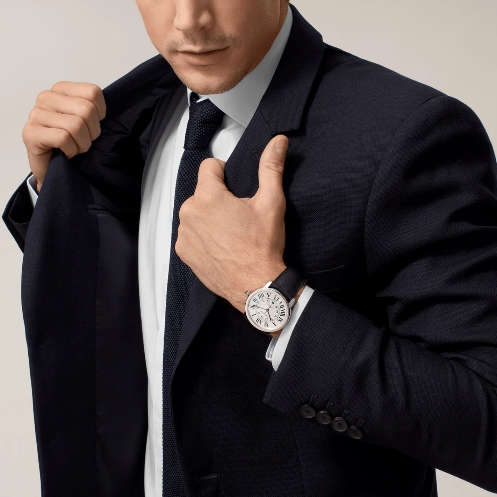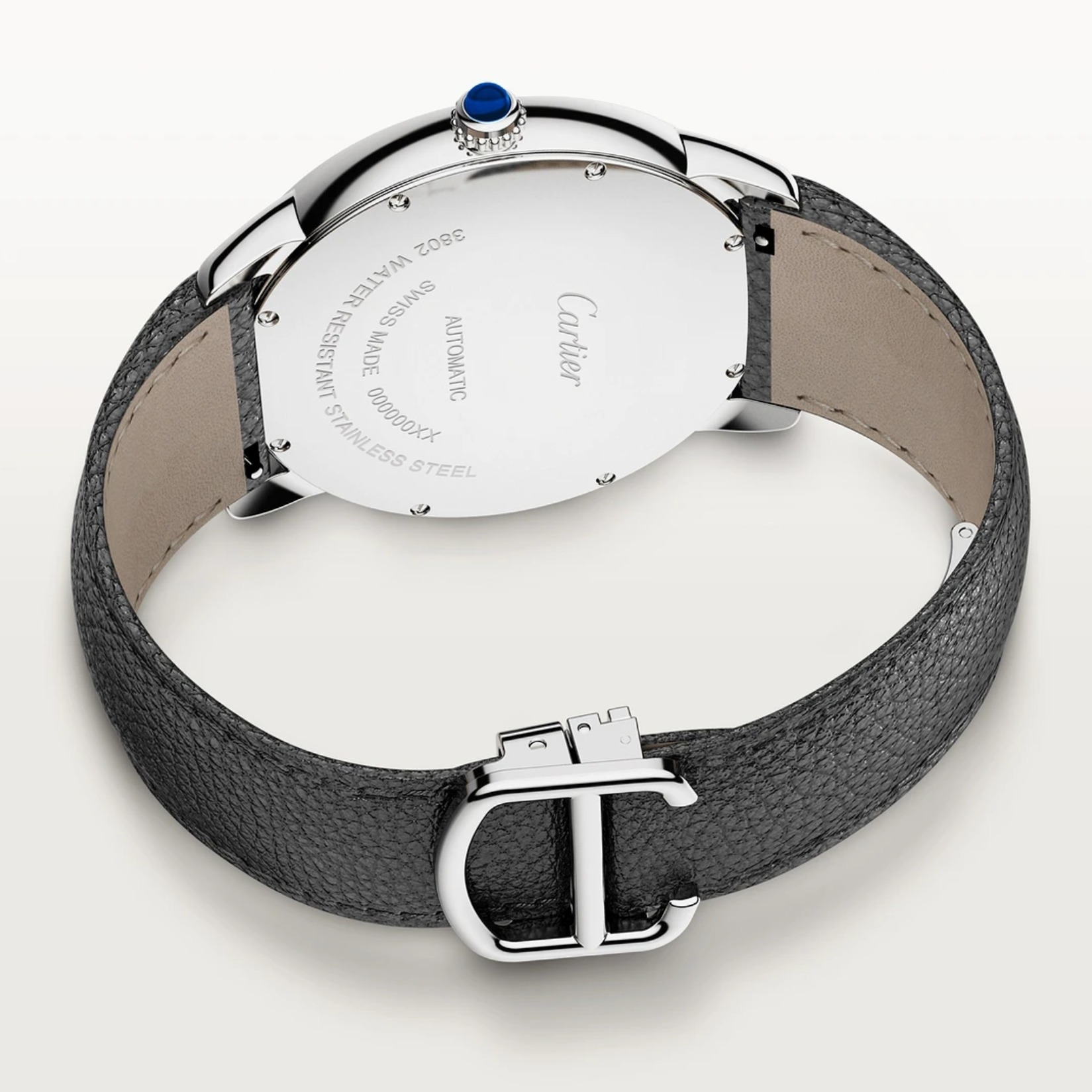 ■製品情報■ロンド ソロ ドゥ カルティエ ウォッチ、42 mm、自動巻きメカニカルムーブメント。スティール製ケース、パール状の飾り付きリューズにシンセティック カボションシェイプ スピネル、シルバー オパライン ダイアル、ブルースティール製剣型針、サファイア クリスタル、付替可能ブラック グレインド カーフスキン ストラップ、スティール製ダブルアジャスタブル デプロワイヤント バックル、3時位置にデイト表示。ケースの厚さ:8.36 mm、日常生活防水。