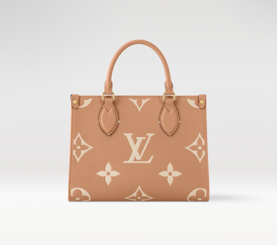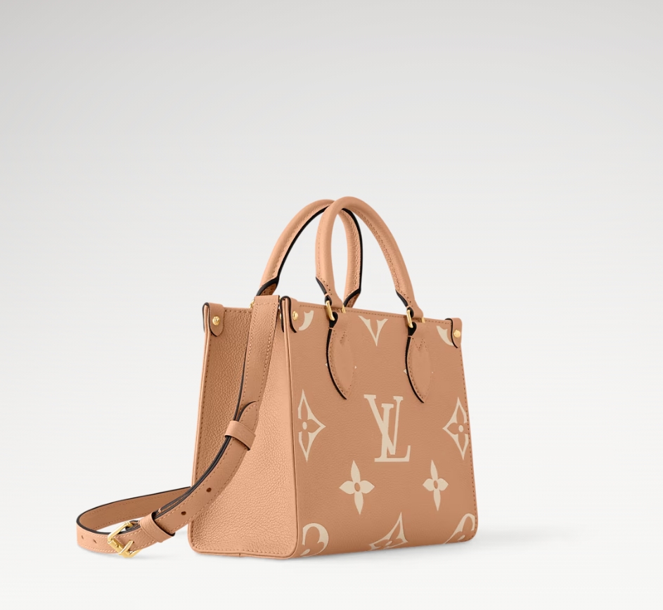 アイコニックなモノグラム・モチーフをコントラストカラーのエンボス加工で施した、メゾンを象徴するレザーで仕上げた「オンザゴー PM」。普段使いにぴったりの洗練されたデザインにゴールドカラーのメタルパーツをあしらいました。関節式のハンドルと調節可能なストラップでさまざまな持ち方を楽しめます。