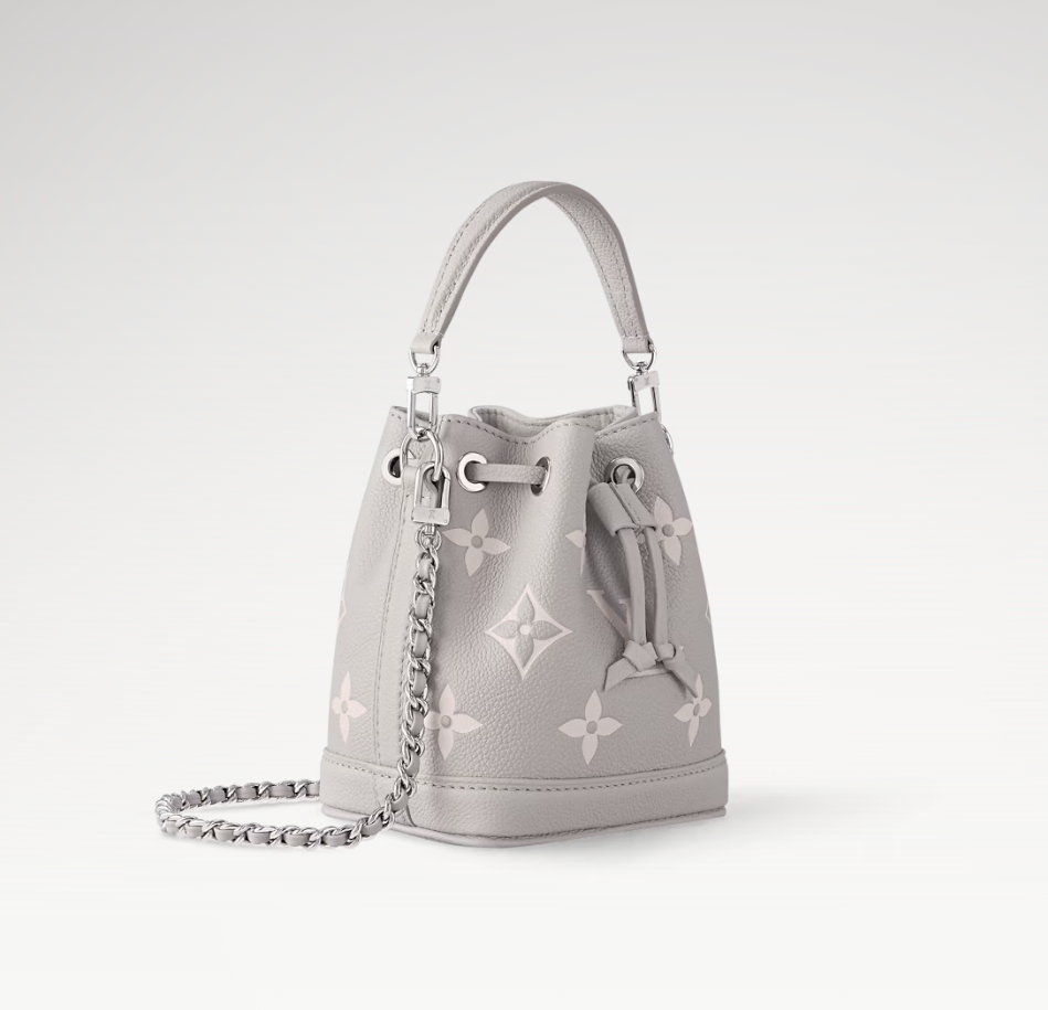 デイタイムからイブニングシーンまで多彩に活躍するバイカラーで、今シーズンならではの雰囲気にアップデートした「ナノ・ノエ」。メゾンを象徴するモノグラム・アンプラント レザーで仕立て、さまざまな持ち方を楽しめる取外し可能なチェーンなど、シルバーカラーのメタルパーツをあしらいました。スマートフォンやコンパクトウォレット、口紅などの普段の必需品をたっぷり収納できる内装も魅力。