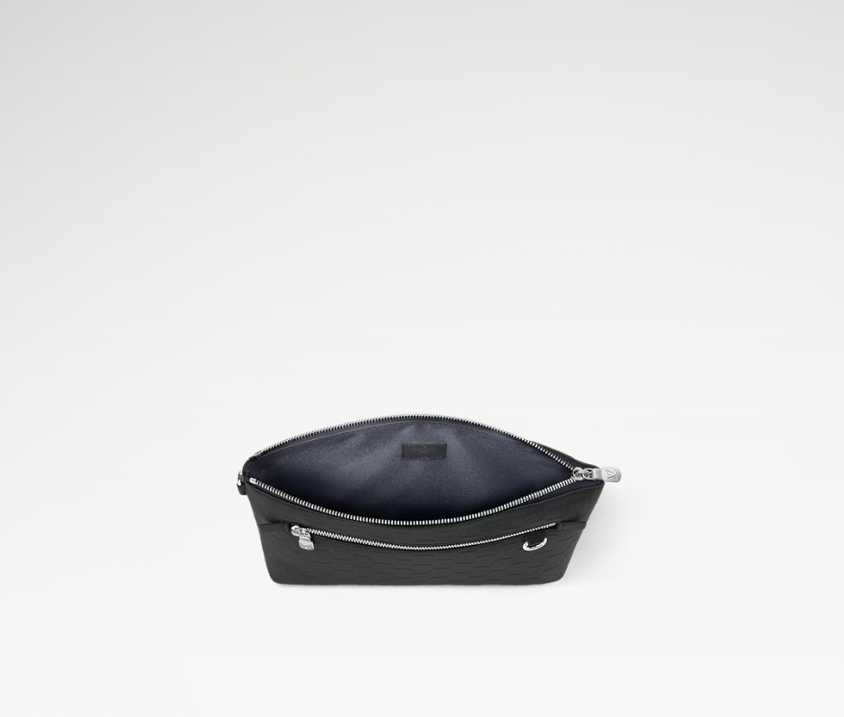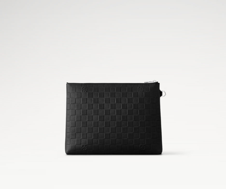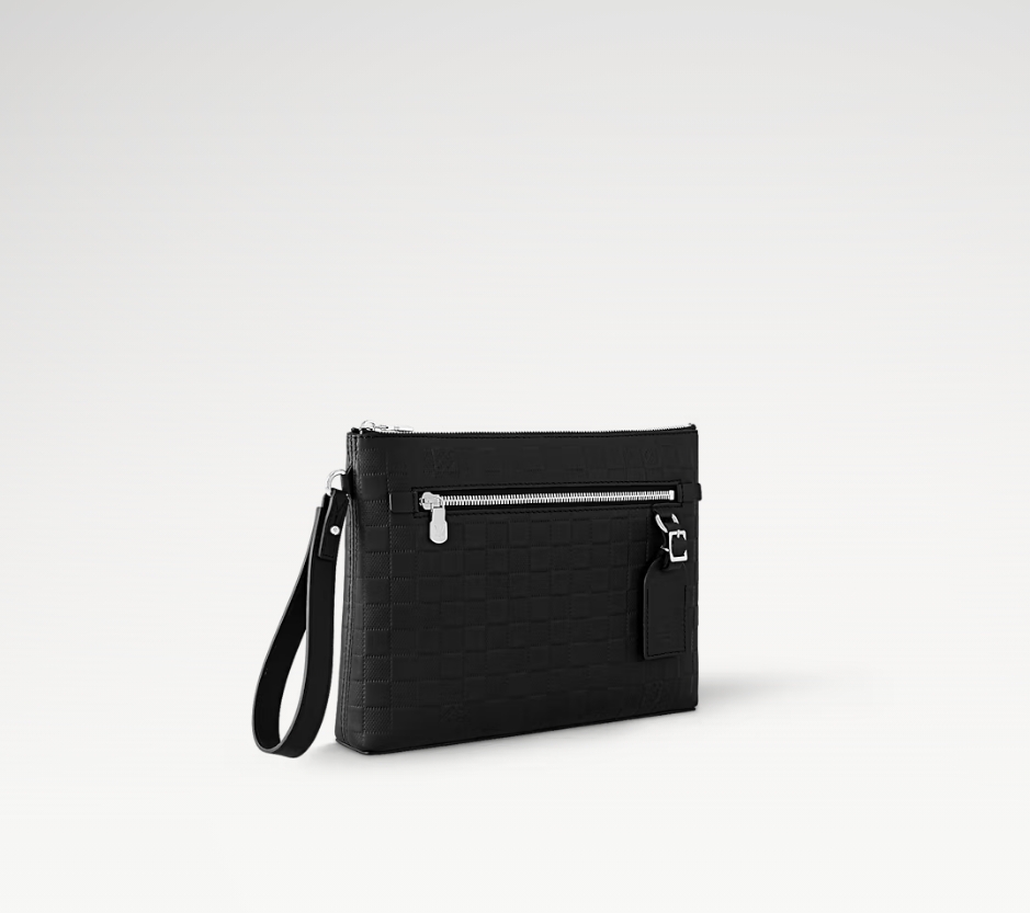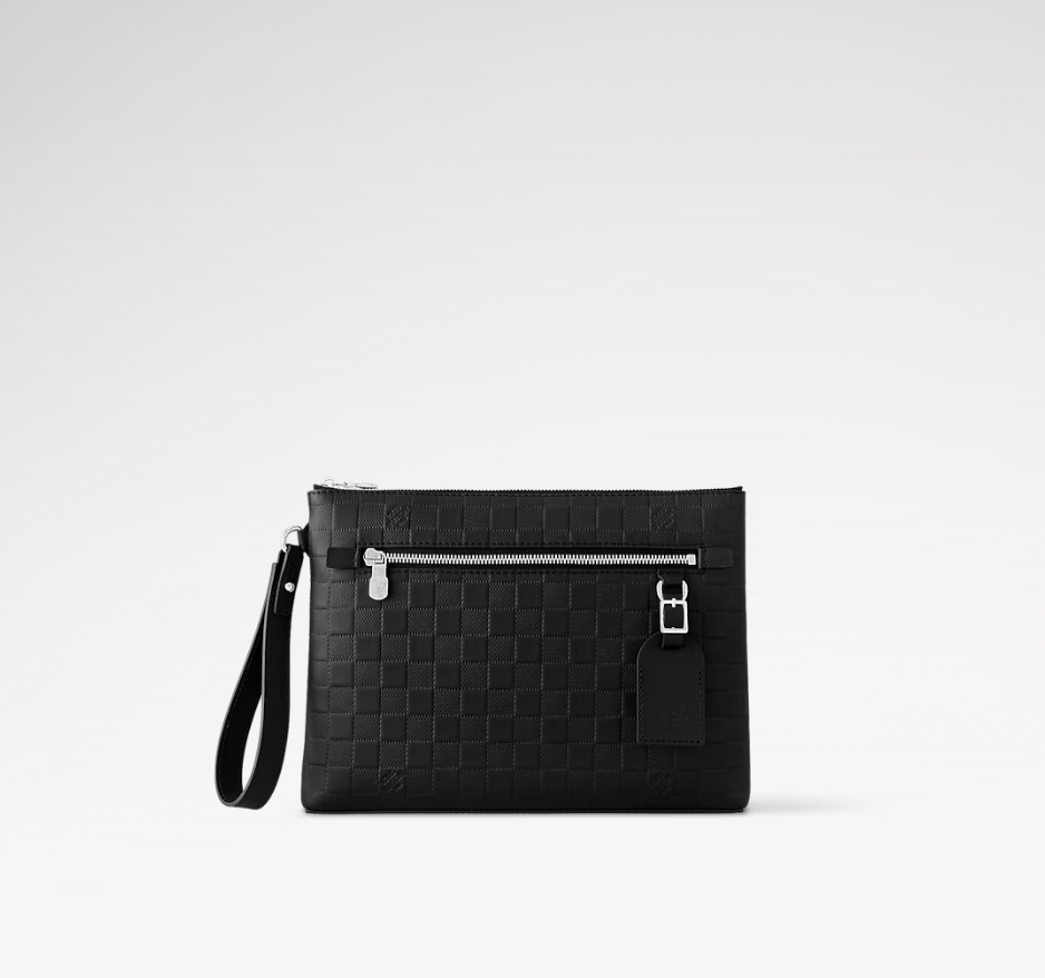 ダミエ・アンフィニ レザーで仕立てた「テイクオフ・ポーチ」。フロントポケットとトップにはブラックカラーのファスナーをあしらいました。小ぶりながらiPadも収納できるバッグは、フォーマルなシーンにもぴったりです。フロントポケットの小ぶりなDリングにあしらったレザーのネームタグが、モダンでラグジュアリーな雰囲気を演出します。