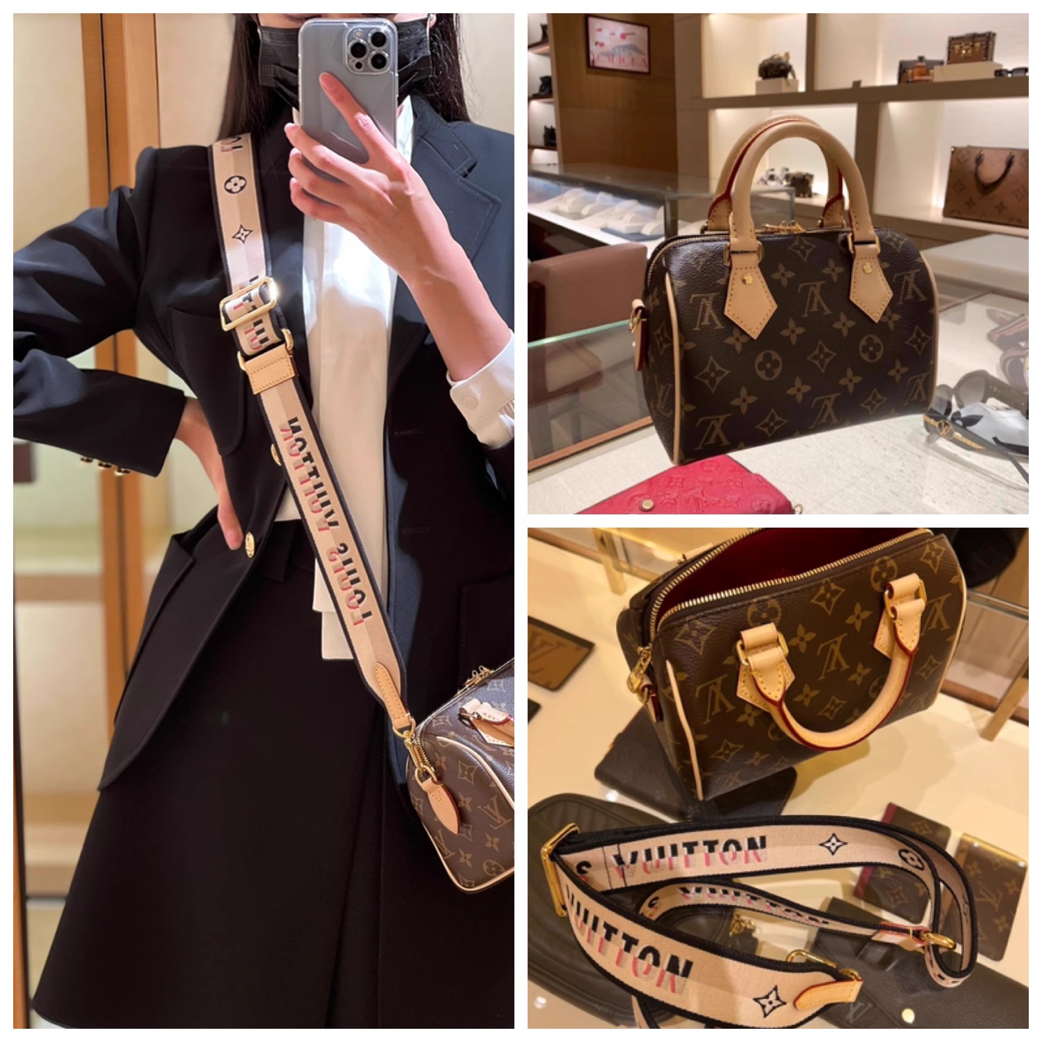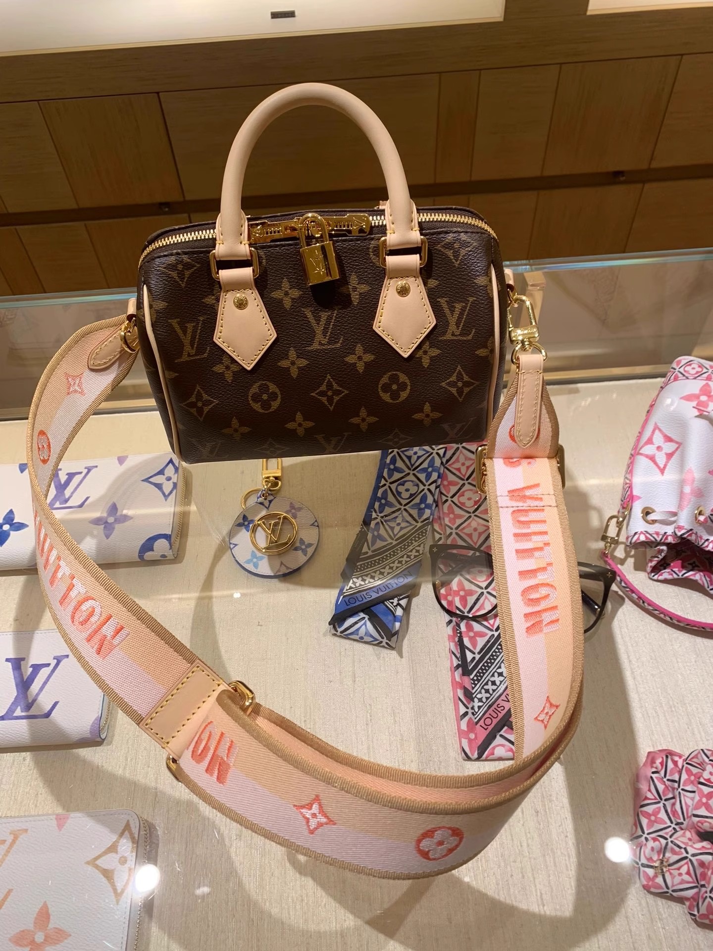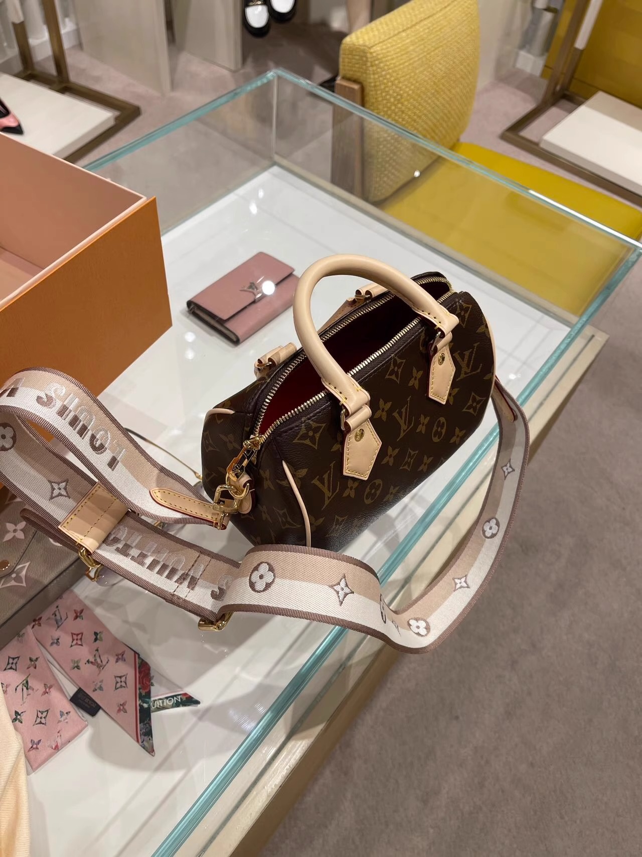 伝統的な旅行鞄「スピーディ」をミニチュアサイズに仕上げた「スピーディ・バンドリエール 20」。モノグラム・キャンバスにヌメ革のトリミングを施して仕立てました。ロール仕上げのレザーハンドルに加え、「Louis Vuitton」シグネチャーを織り込んだ取外しと調整が可能な幅広のテキスタイルストラップを備えています。クラシカルなデザインに、レッドのテキスタイルライニングが際立ちます。