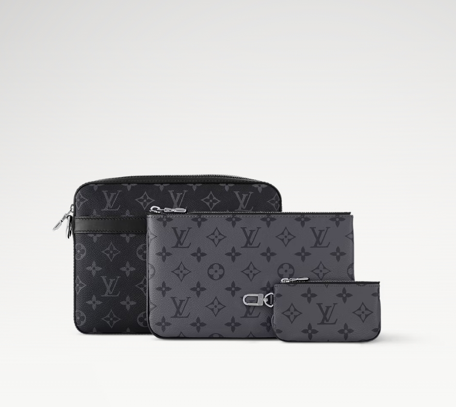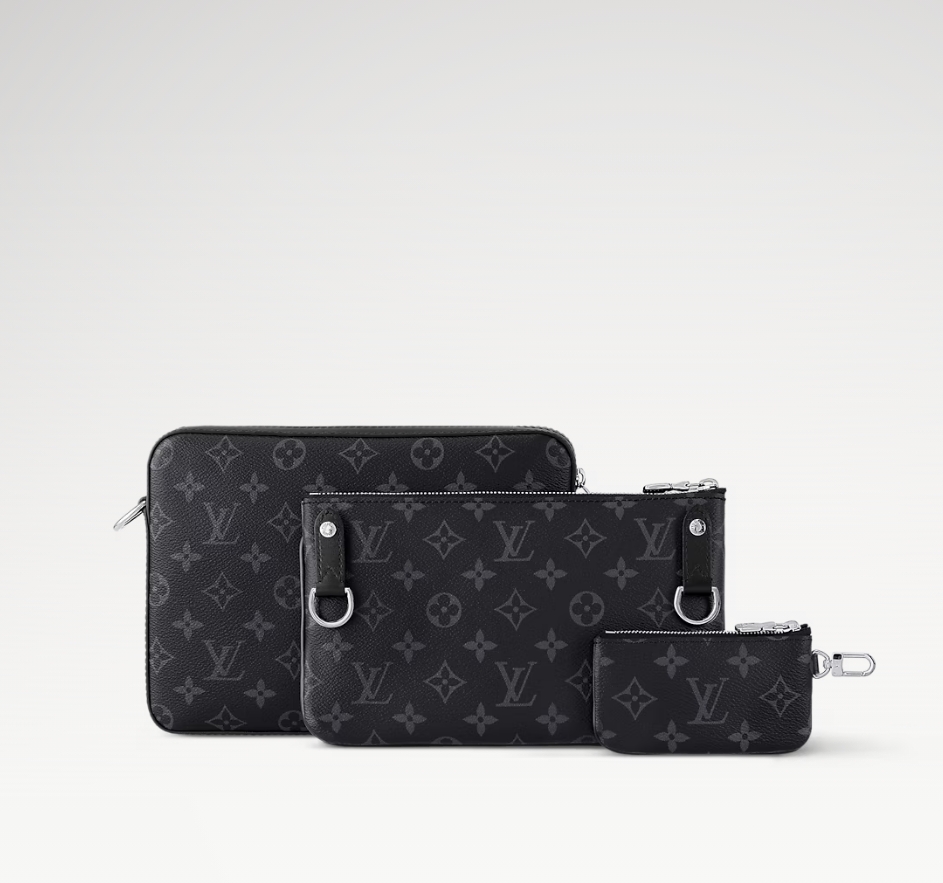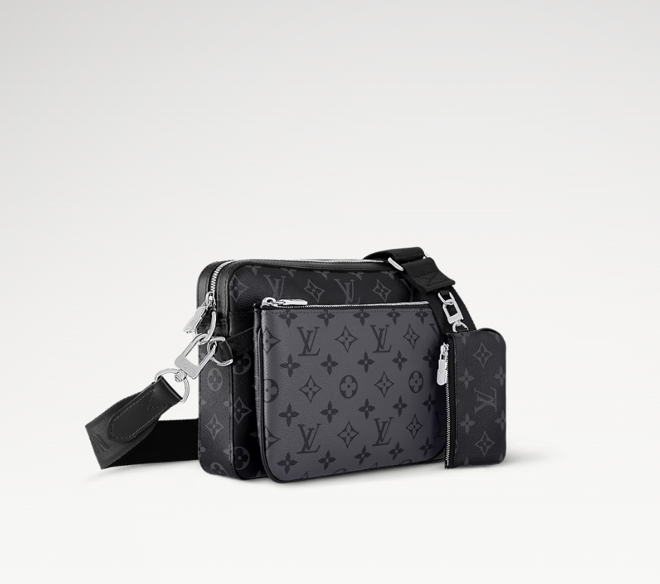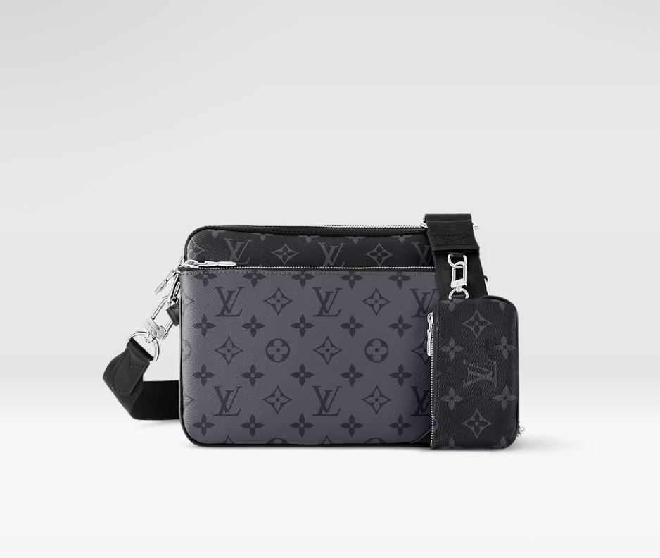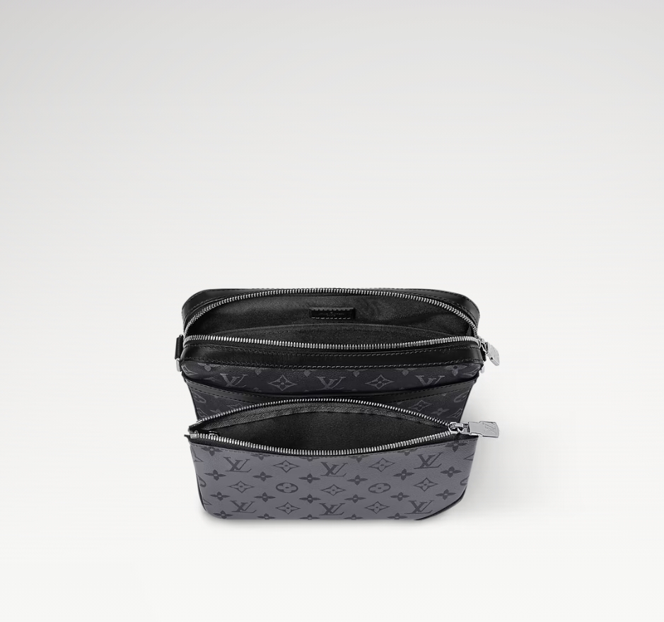 モノグラム・エクリプス キャンバスと、そのカラーを反転させたモノグラム・エクリプス リバース キャンバスを使用した「トリオ・メッセンジャー」。トーン・オン・トーンのグレーの色合いであしらったアイコニックなモチーフが、機能的なハイブリッドデザインを際立たせます。ボディには取外し可能なファスナー付きポケットを、ストラップにも同じく取り外し可能なコインパースを備えた、伝統的なクロスボディバッグを進化させたアイテムです。