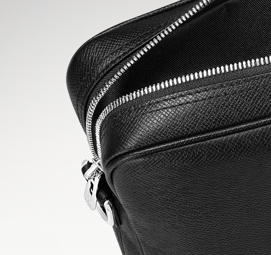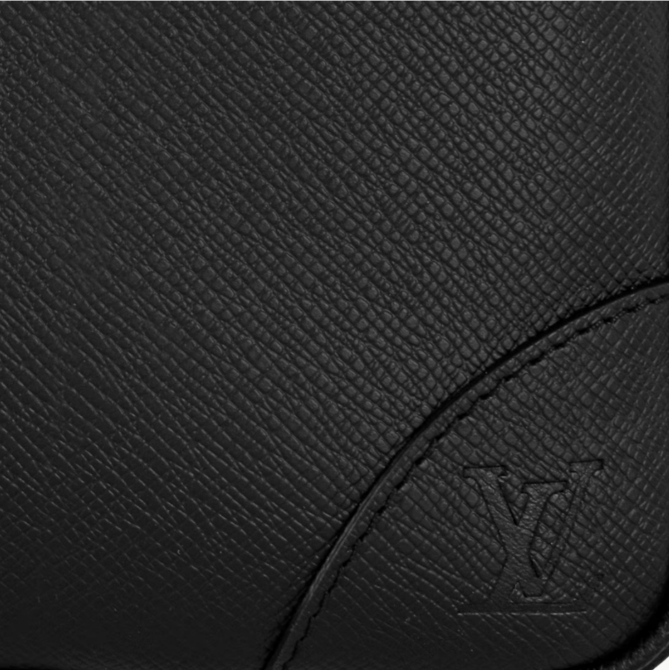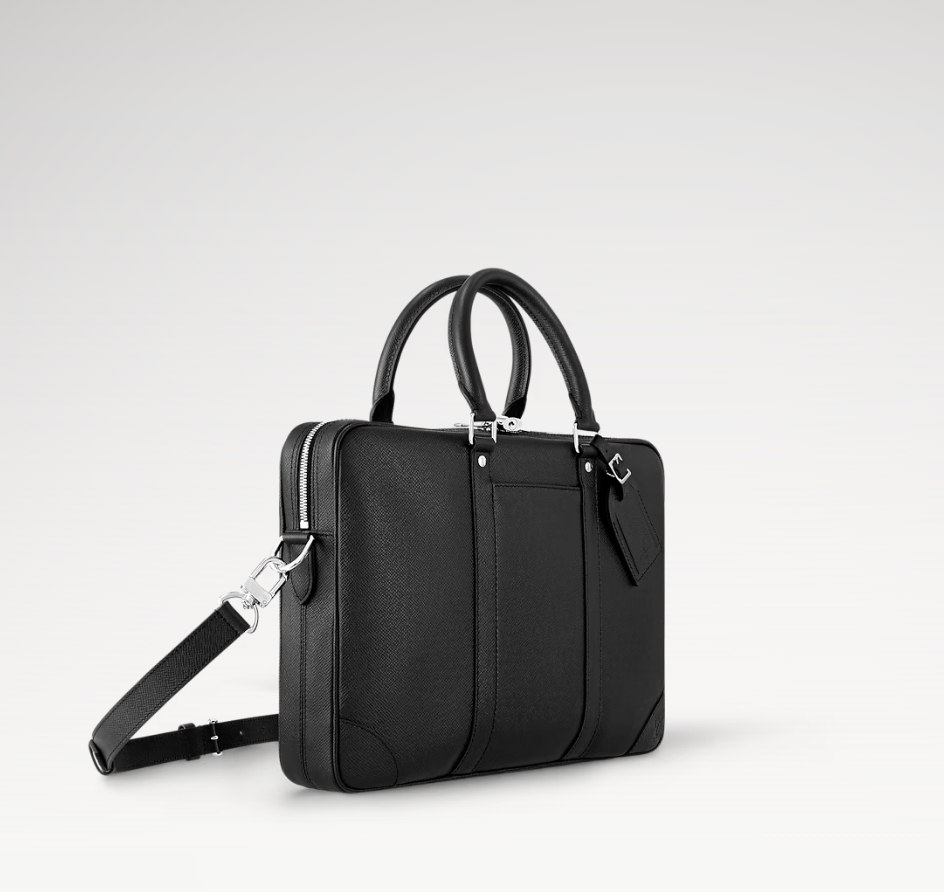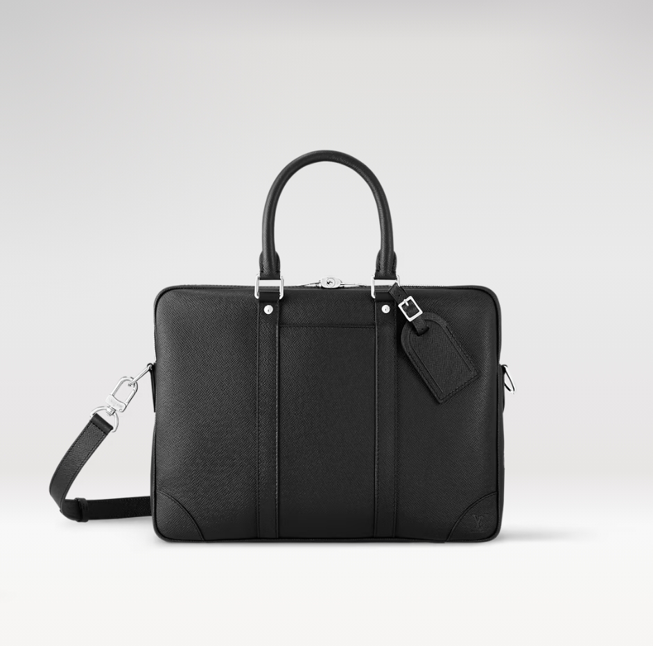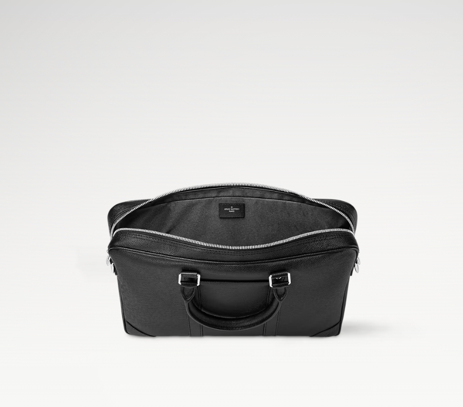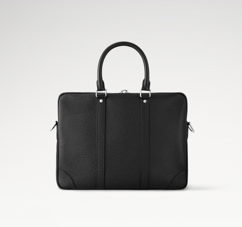 タイガ・ノワール レザーで仕立てた「ポルト ドキュマン・ヴォワヤージュ」。なめらかに磨き上げたカウハイドレザーにエンボス加工で施した細かいグレイン(型押し)が特徴の、メゾンのアイコニックなレザーです。13インチのノートパソコンをすっきり収納できるパッド入りの内装と、背面に配した2つのフラットポケットが魅力。トップハンドルと、取外し & 調節可能なショルダーストラップ付きで、さまざまな持ち方をお楽しみいただけます。