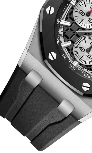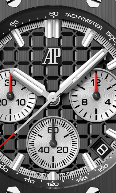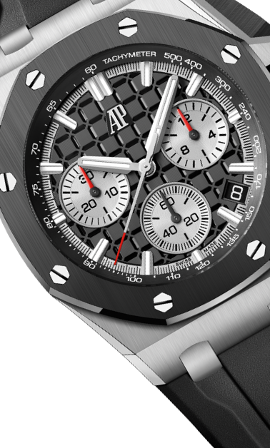 文字盤:「グランド・タペストリー」模様のシルバーダイヤル、ブラックのカウンターとインナーベゼル、ホワイトゴールド製アプライドアワーマーカーと蓄光処理を施したロイヤルオーク針。