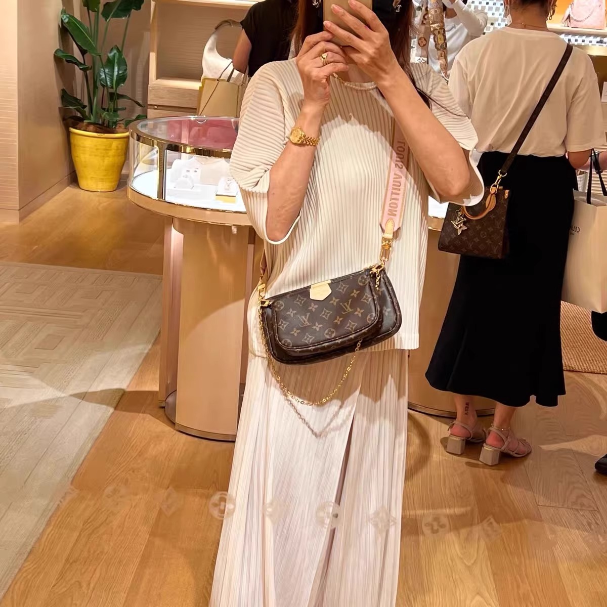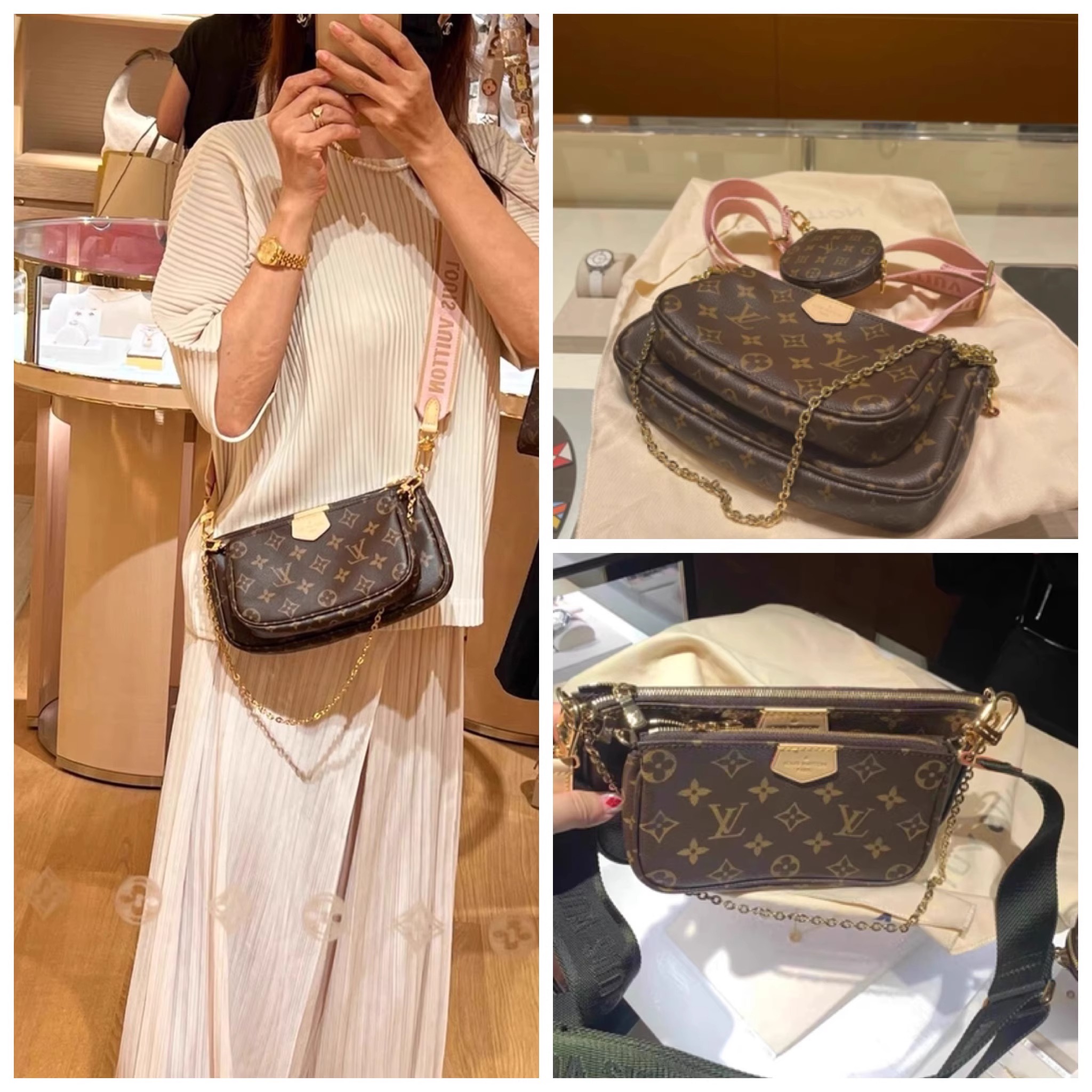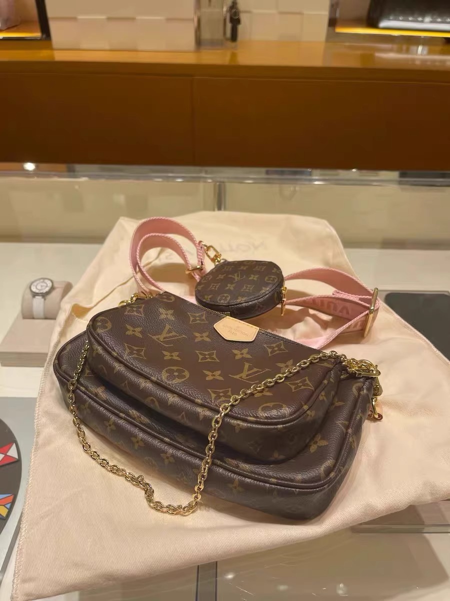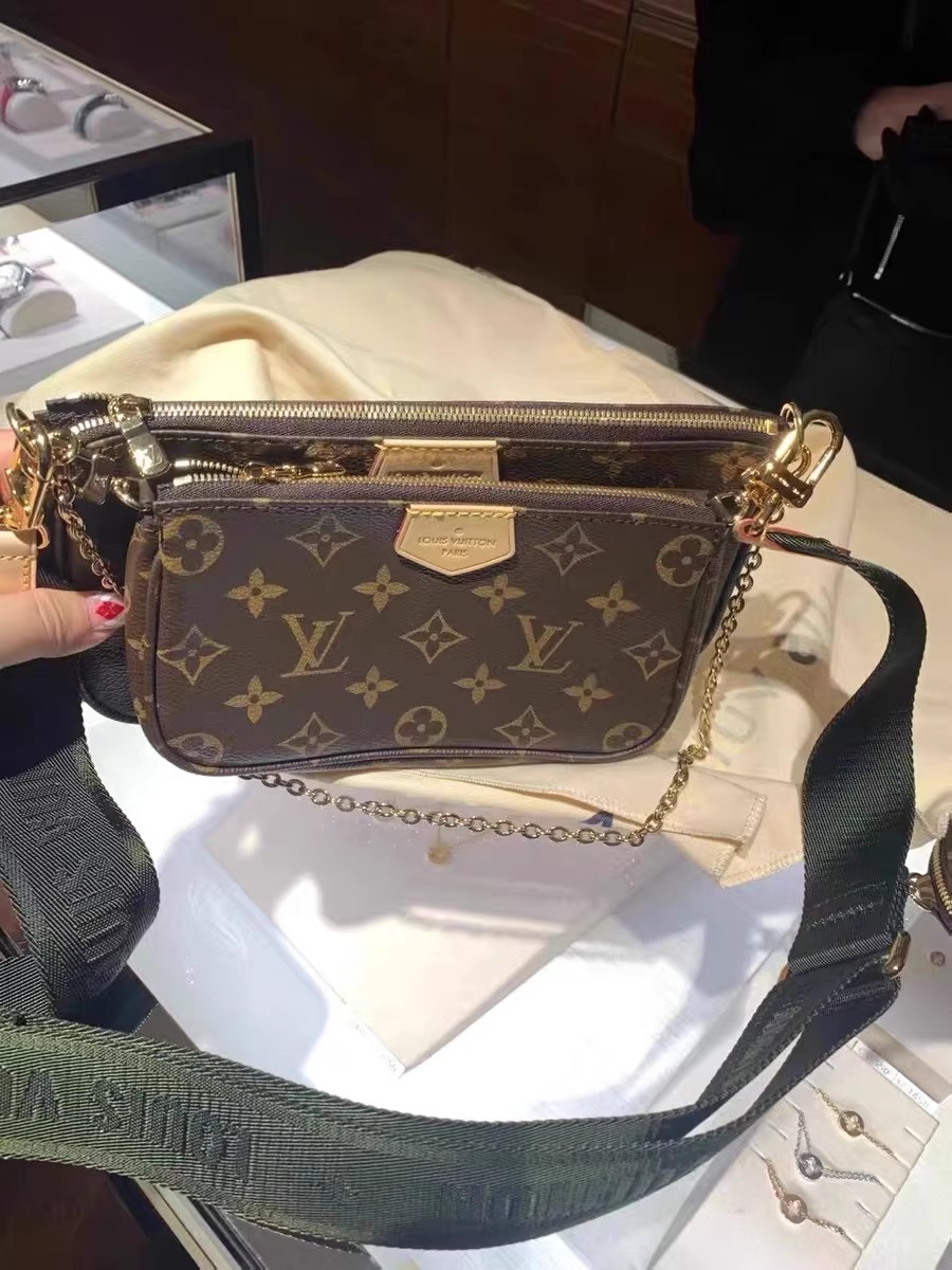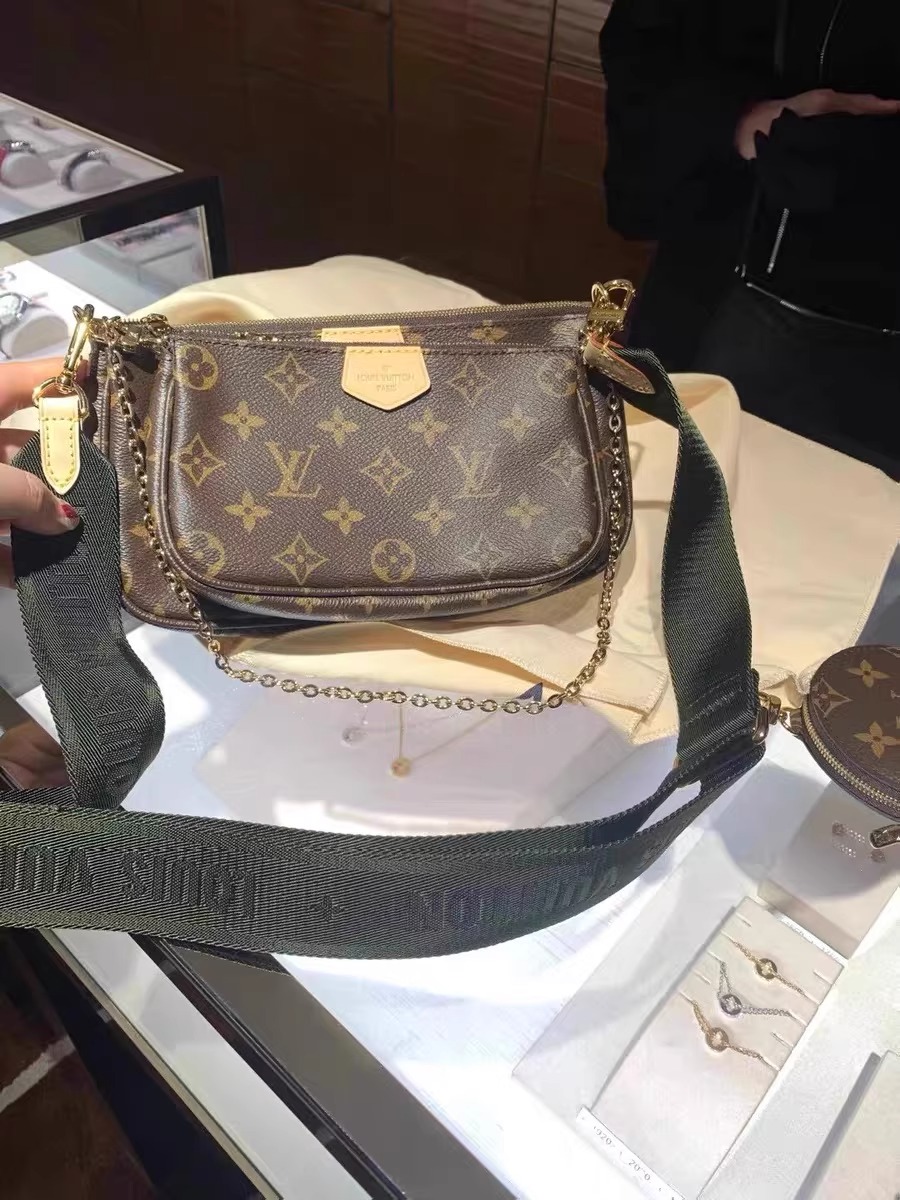 複数のポケットとコンパートメントを備え、クロスボディバッグとして多用途にお使いいただける「ミュルティ・ポシェット・アクセソワール」。「ポシェット・アクセソワール」、「ミニ・ポシェット・アクセソワール」、「ポルトモネ・ロン」を組み合わせたアイテムです。ポシェットには取外し可能なゴールドカラーのチェーンと「Louis Vuitton」の文字を織り込んだジャカード生地の調節可能なストラップが付属し、さまざまな持ち方をお楽しみいただけます。