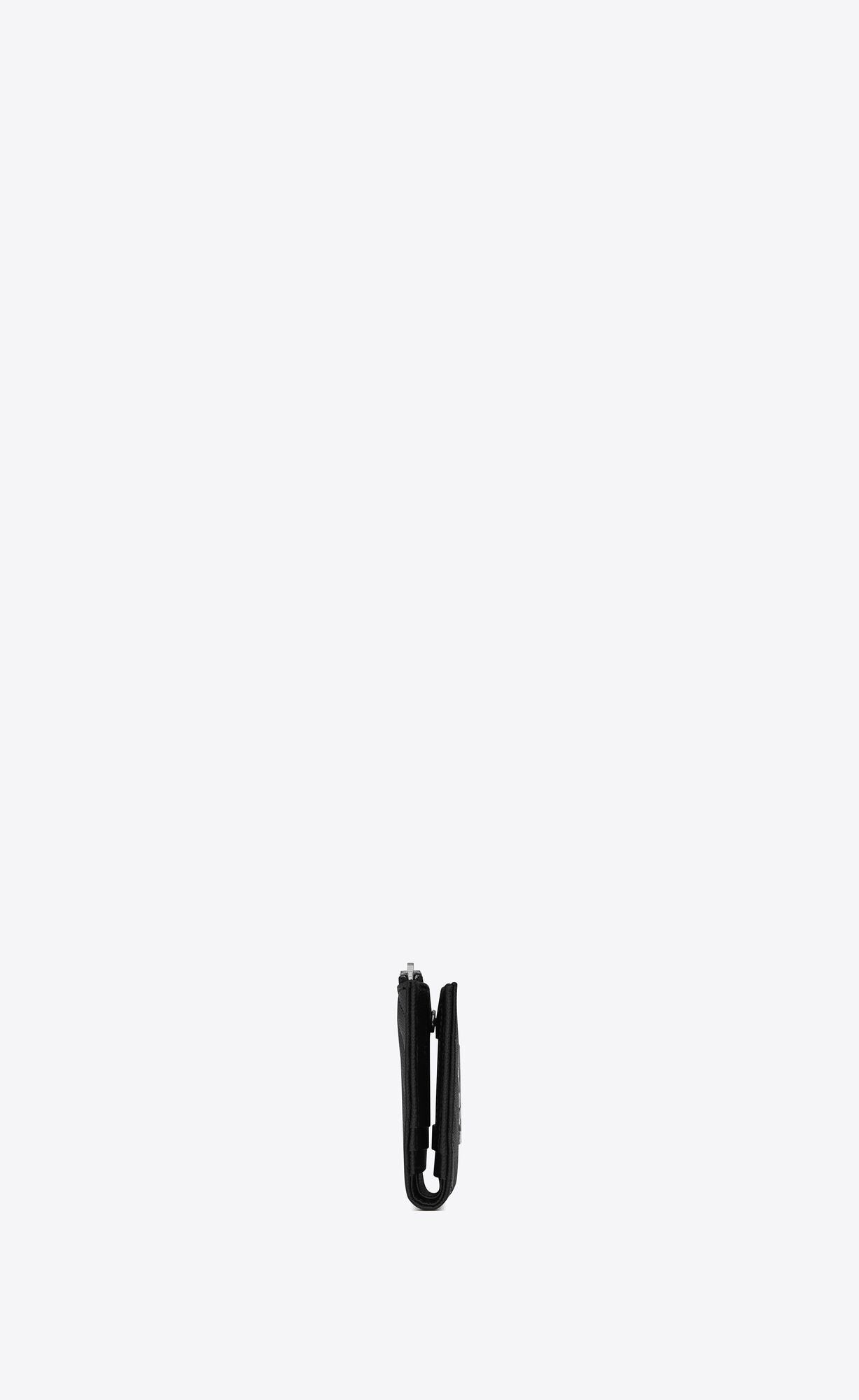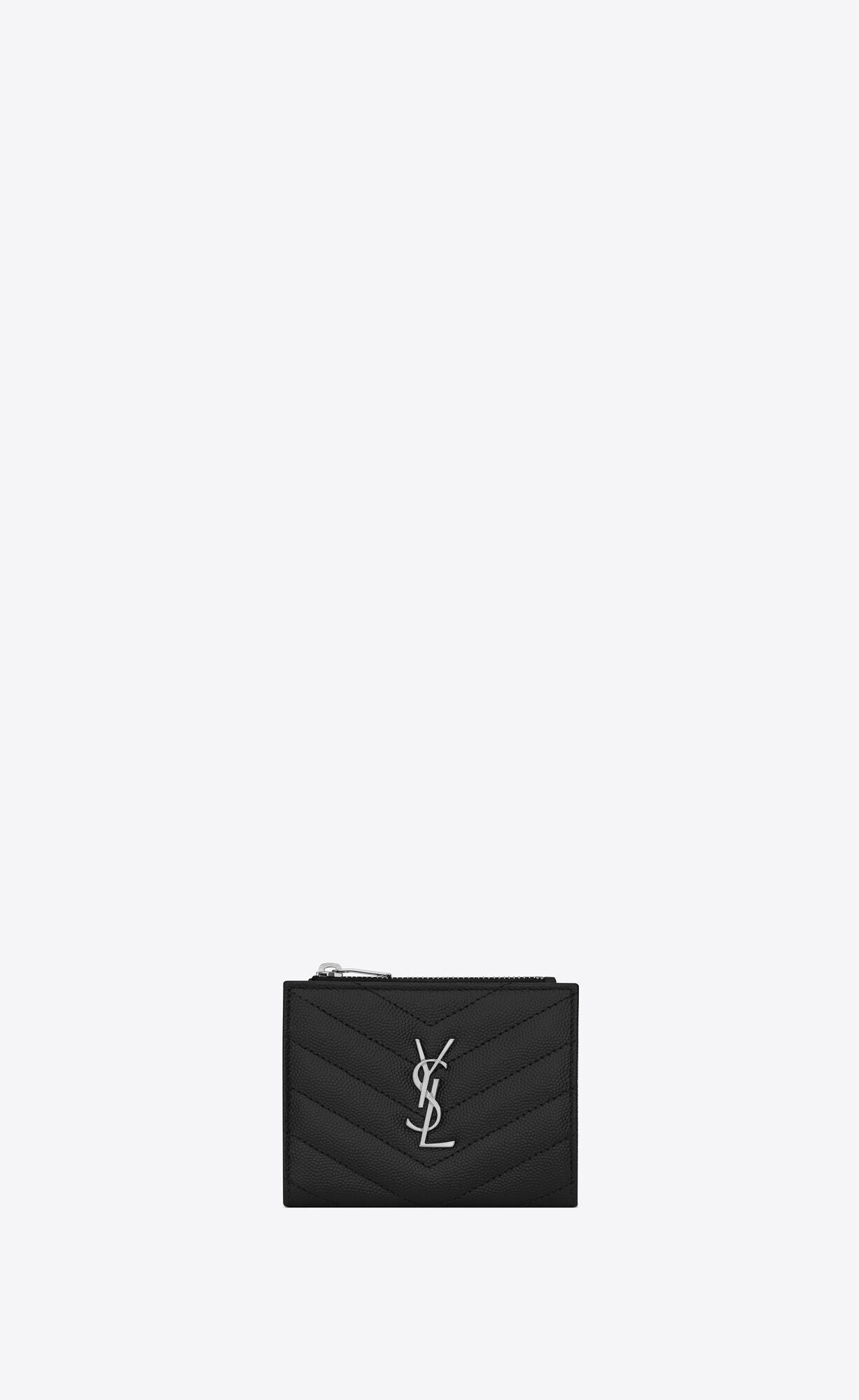サンローランのカードバッグ。YSLの文字と金属製の接続部分、キルティングステッチで装飾されています。