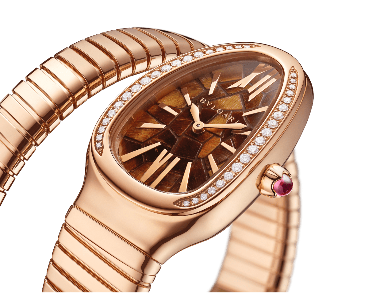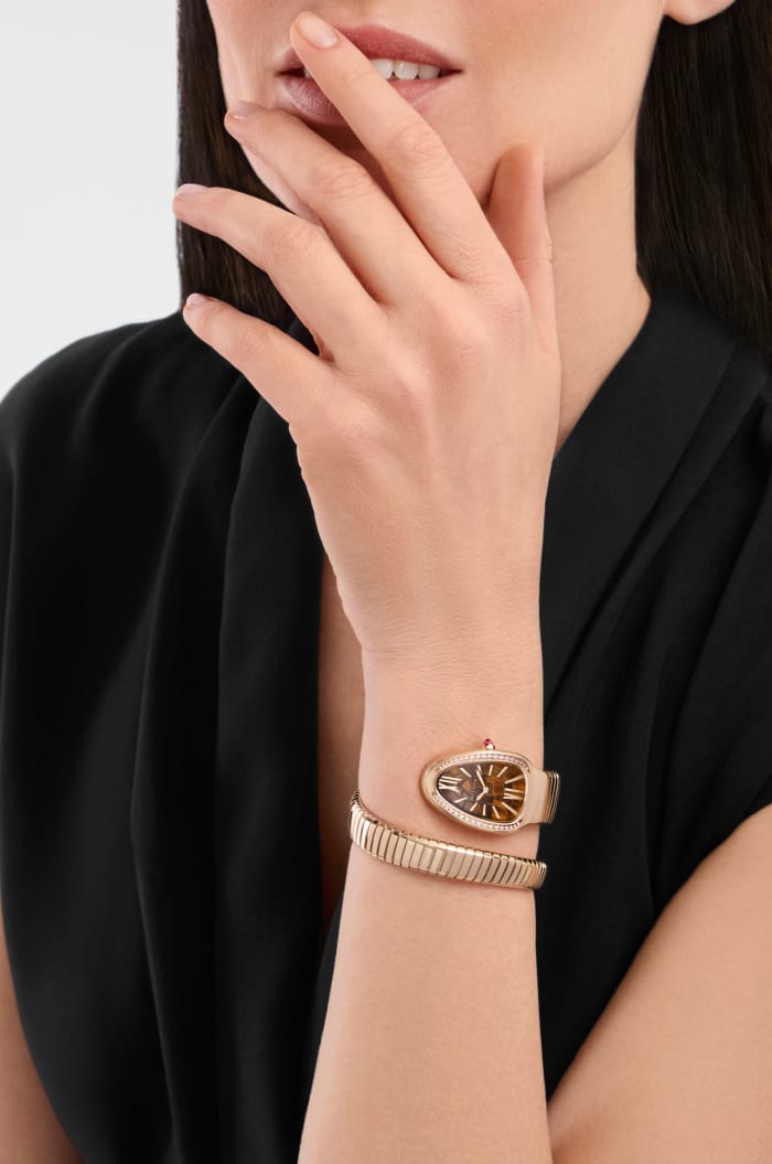 ブルガリのクリエイティビティを象徴する2つの美的シグネチャーを融合させた、セルペンティ トゥボガス シングルスパイラルウォッチ。18Kピンクゴールド製 。ダイヤモンドをセットしたベゼル。ヘビのしなやかさとトゥボガスの現代的な魂が絡み合う独創的なクリエイション。 ブルガリと安藤忠雄氏によるアーティスティックなコラボレーションから生まれたリミテッドエディション。日本の建築家、安藤忠雄氏がタイガーアイのダイアルを通し、自然のはかない輝きと四季のエッセンスを捉えました。秋らしいニュアンスを表現しています。セルペンティ トゥボガス 安藤忠雄 限定モデル オータム エディション。クオーツムーブメント。時・分表示。35mmの18Kピンクゴールド製ケース。38個のダイヤモンド(0.29カラット)をセットした18Kピンクゴールド製ベゼル。カボションカットのピンク・ルベライトをセットした18Kピンクゴールド製リューズ。タイガーアイのダイアル。ピンクゴールドプレートの針。18Kピンクゴールド製シングルスパイラルブレスレット。安藤忠雄氏のサインと「Tadao Ando Limited Edition」のエングレーヴィングでパーソナライズされたケースバック。 サイズ 135 mm、 30メートル防水。