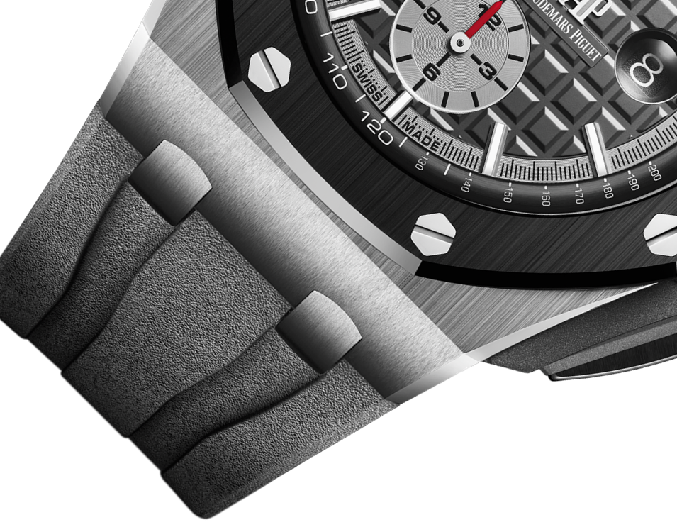「メガ・タペストリー」模様のスレートグレーダイヤル、ロジウムカラーのカウンター、ホワイトゴールド製アプライドアワーマーカーと蓄光処理を施したロイヤルオーク針、スレートグレーインナーベゼル。