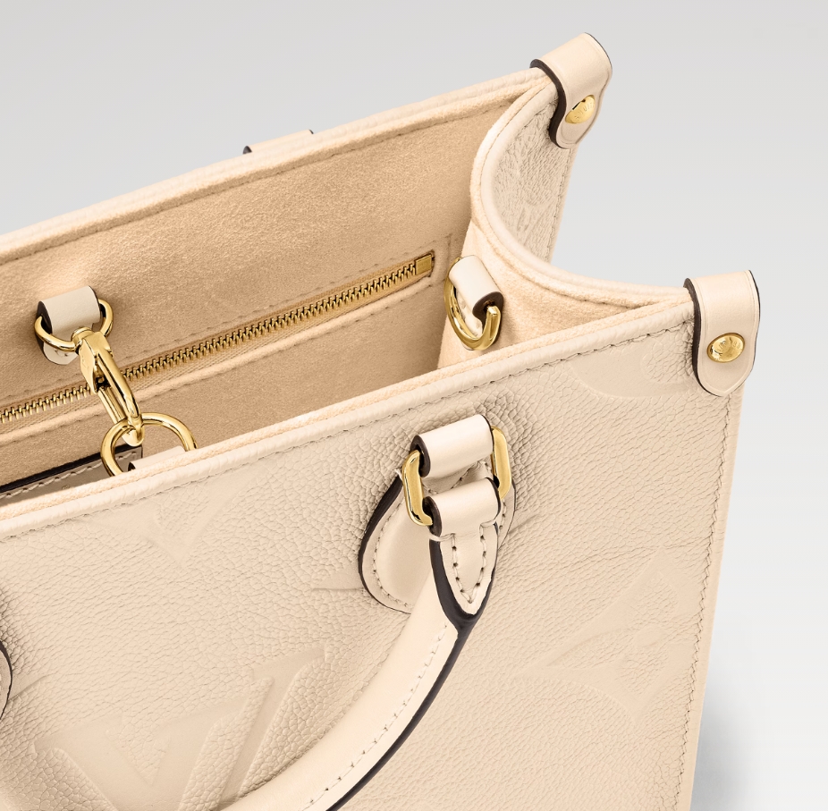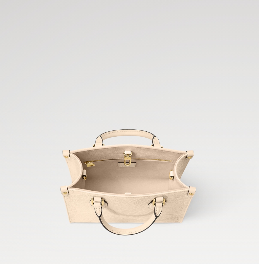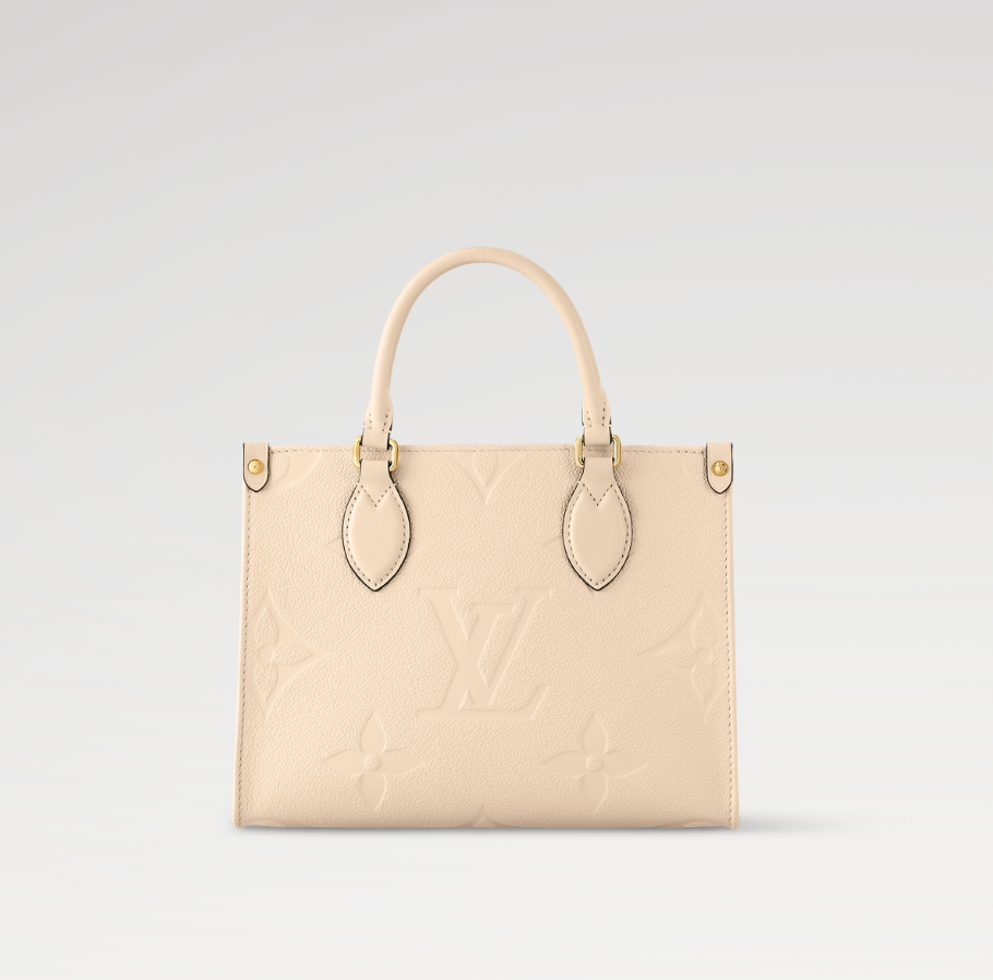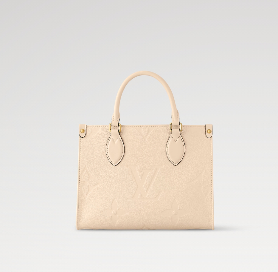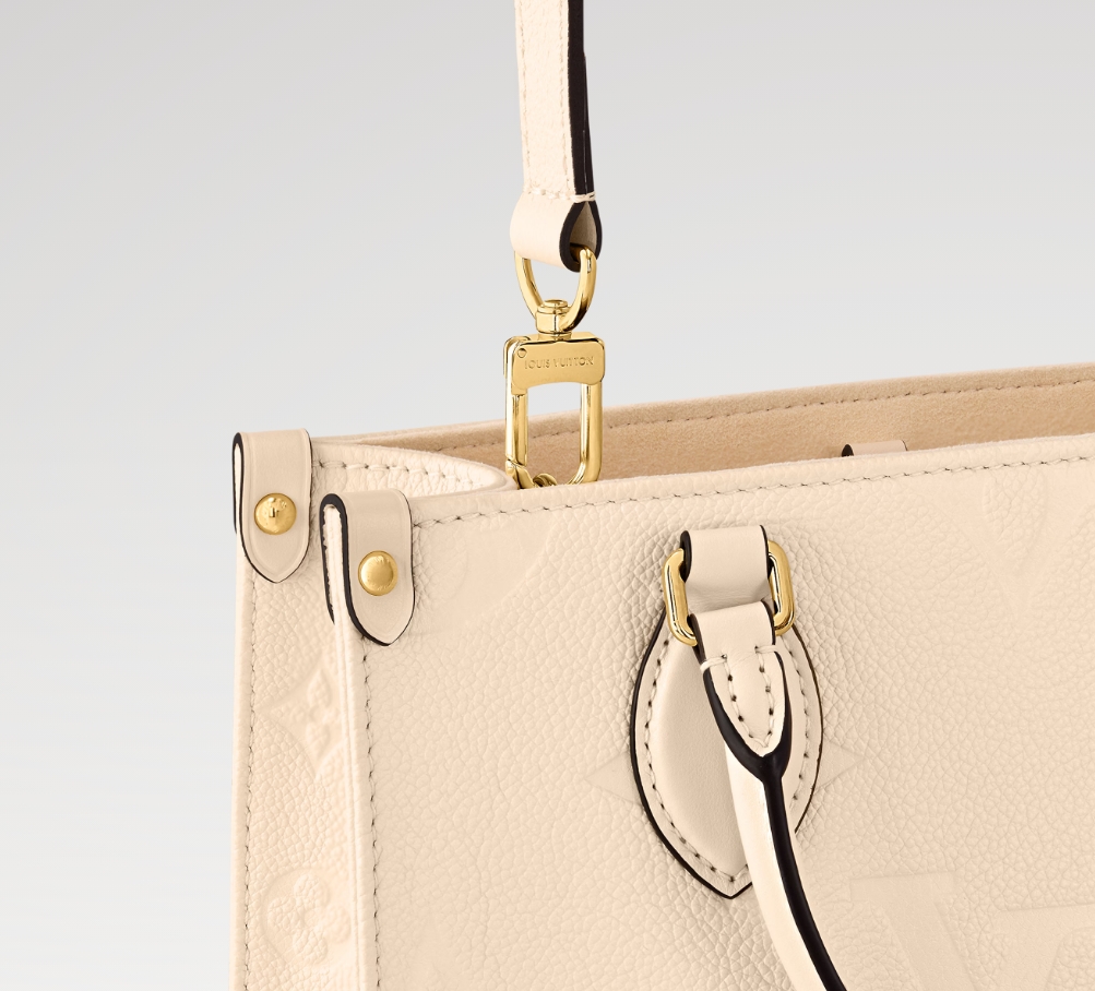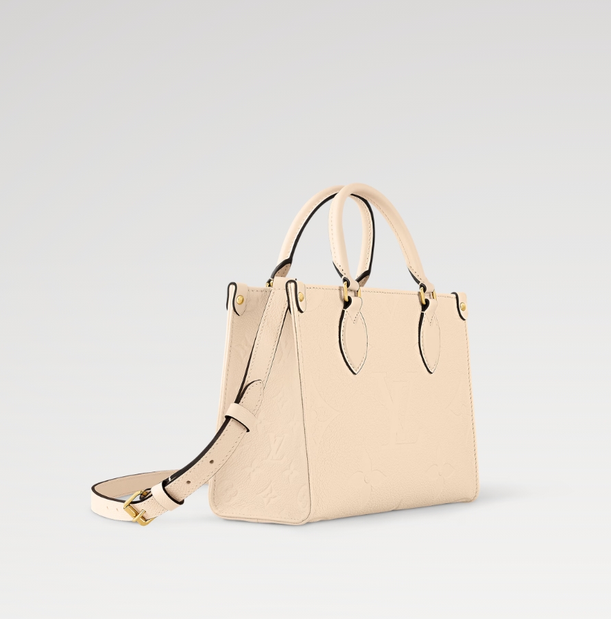 柔らかなクリームカラーのモノグラム・アンプラント レザーで仕上げた艶やかな「オンザゴー PM」。レザーにエンボス加工されたモノグラム・パターンが、この小ぶりなバッグの長方形のラインを引き立てます。ミニタブレットをはじめとする必需品が収まるサイズも魅力。2本のロール仕上げのレザーハンドルと取外し可能なストラップで、さまざまなスタイルを楽しめます。