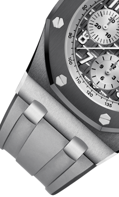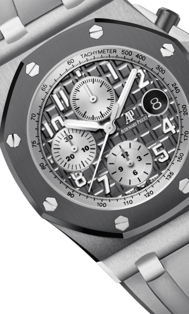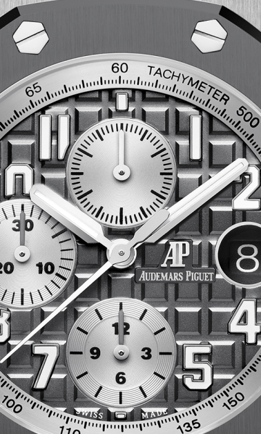 文字盤:「グランド・タペストリー」模様のシルバーダイヤル、ブラックのカウンターとインナーベゼル、ホワイトゴールド製アプライドアワーマーカーと蓄光処理を施したロイヤルオーク針。