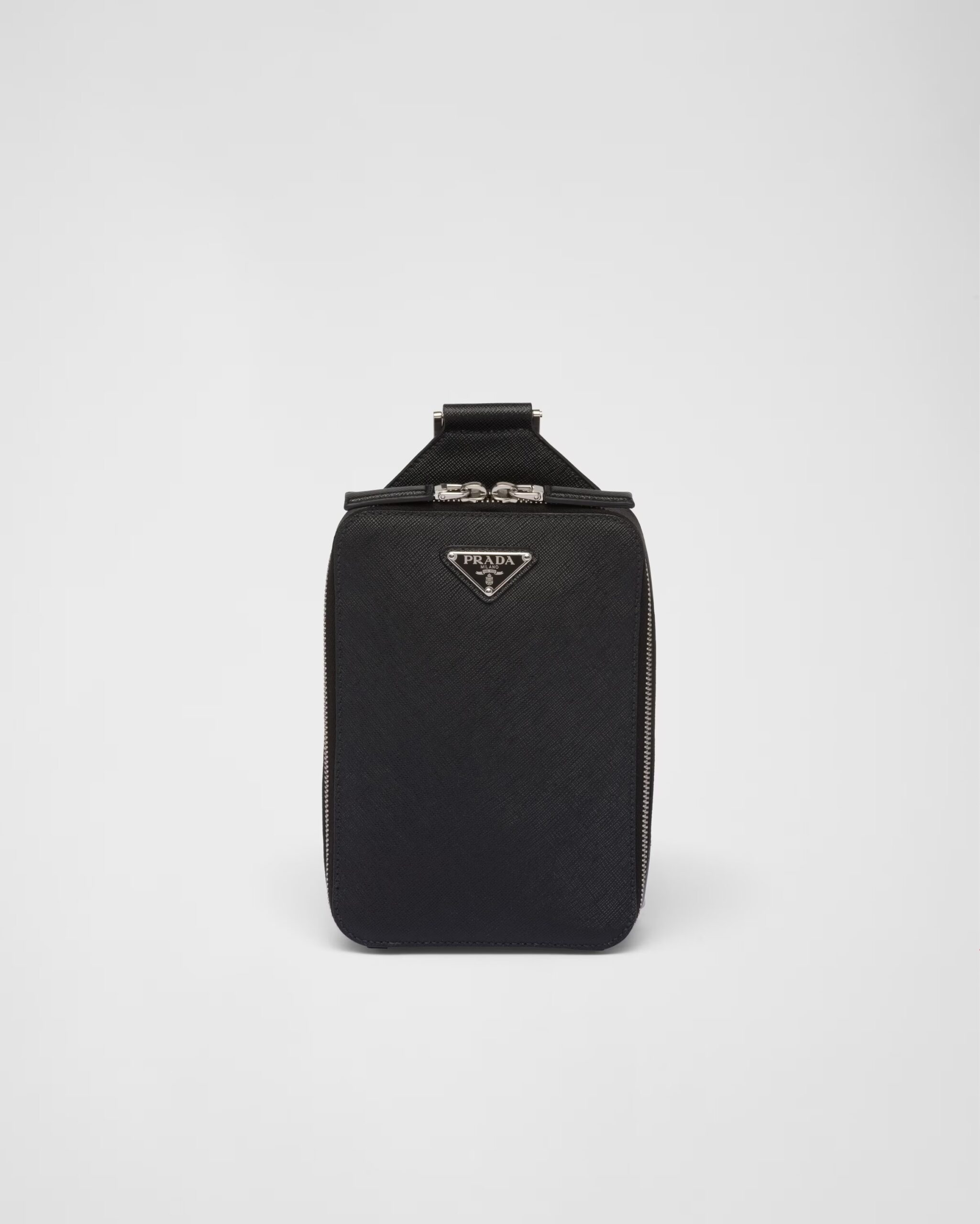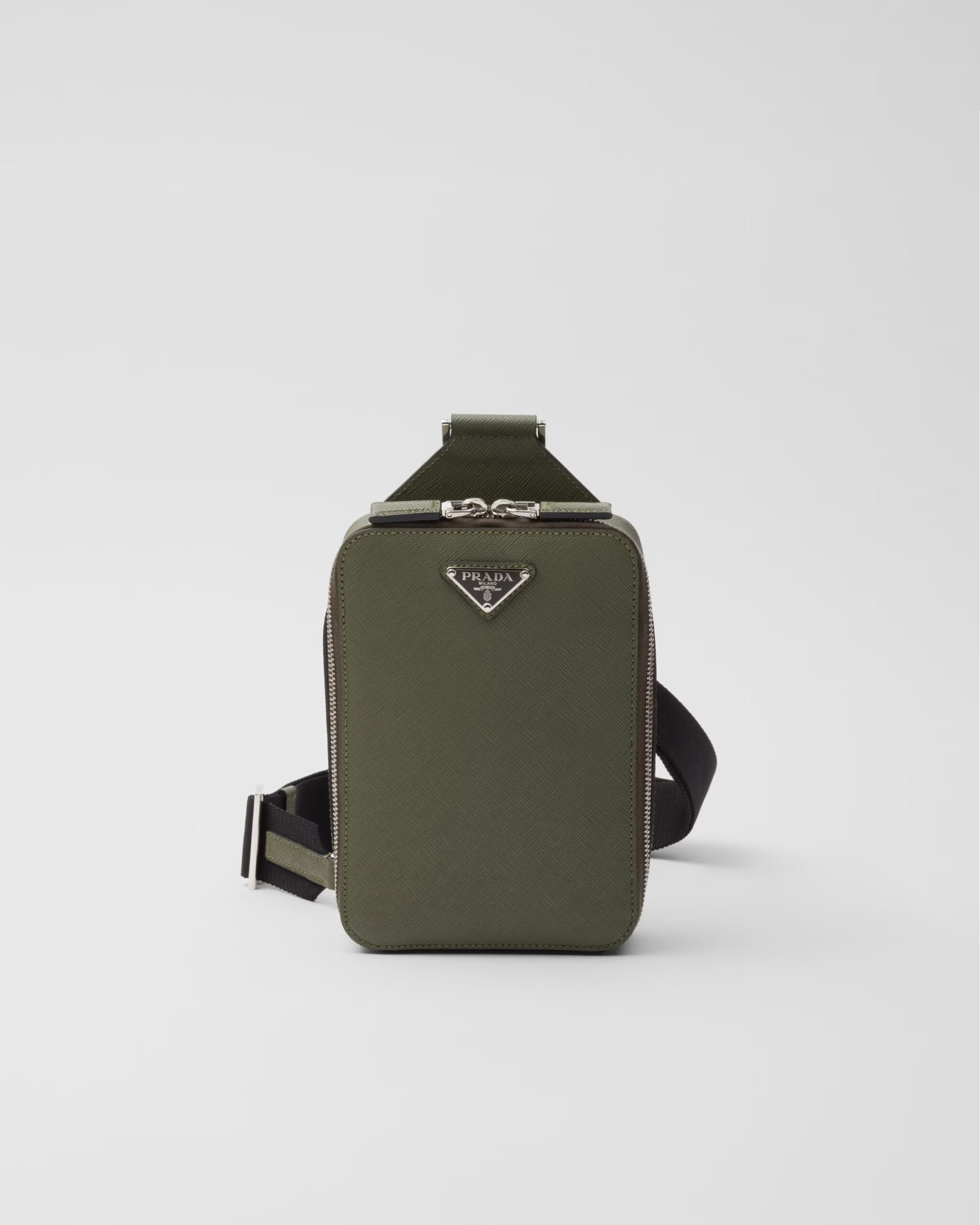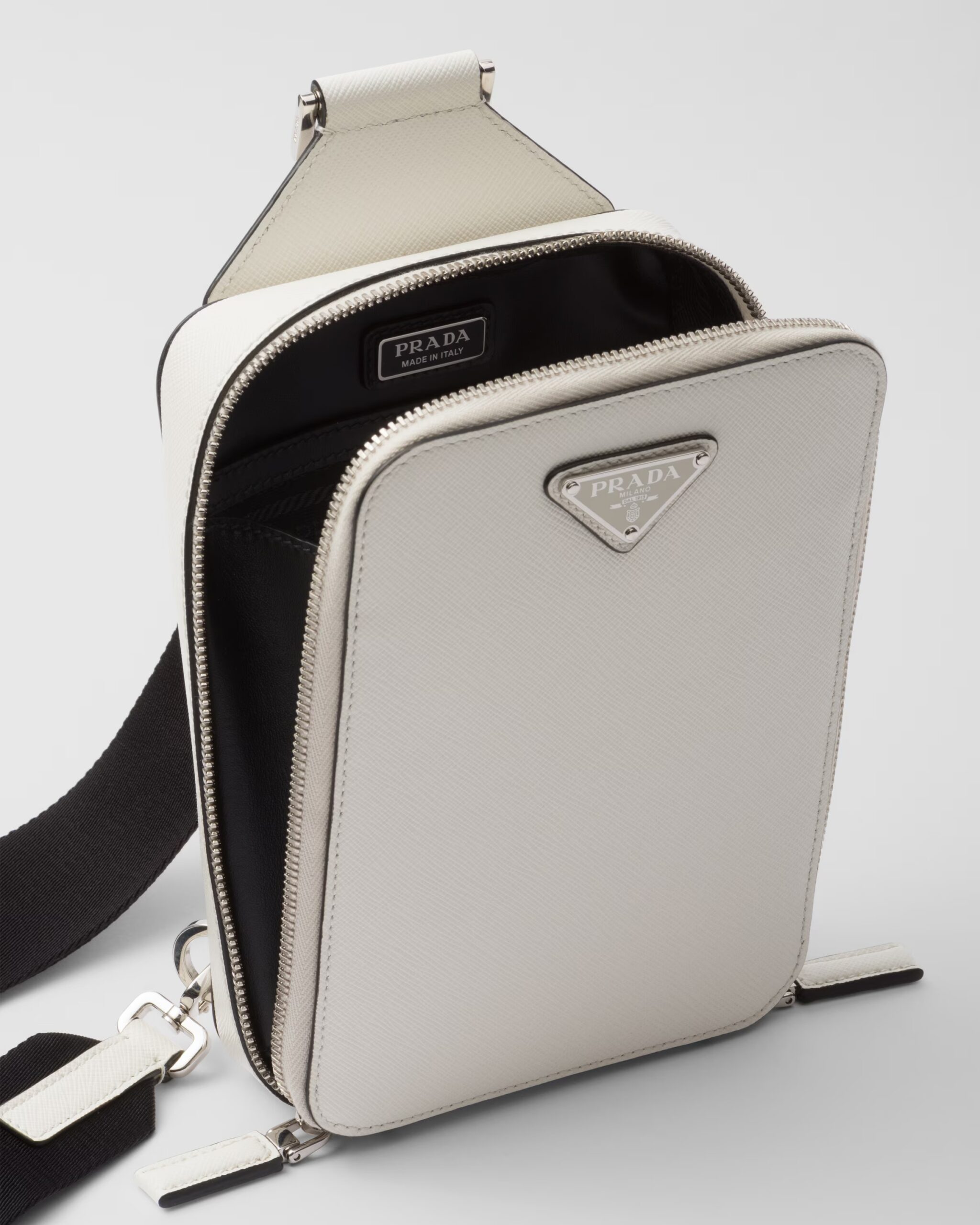 調節可能なナイロンテープとレザーのショルダーストラップフロントにエナメルメタルのトライアングルロゴ付ファスナー開閉式内側にパッチポケットロゴプリント入りナイロンライニング付高さ: 20cm幅: 14cmマチ: 4cm