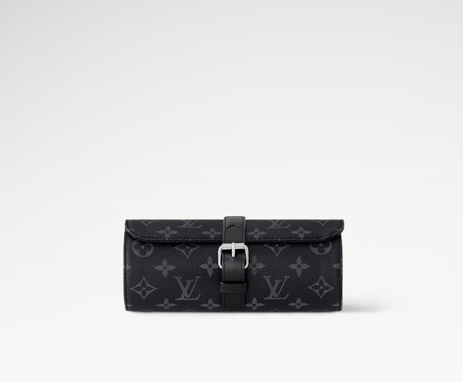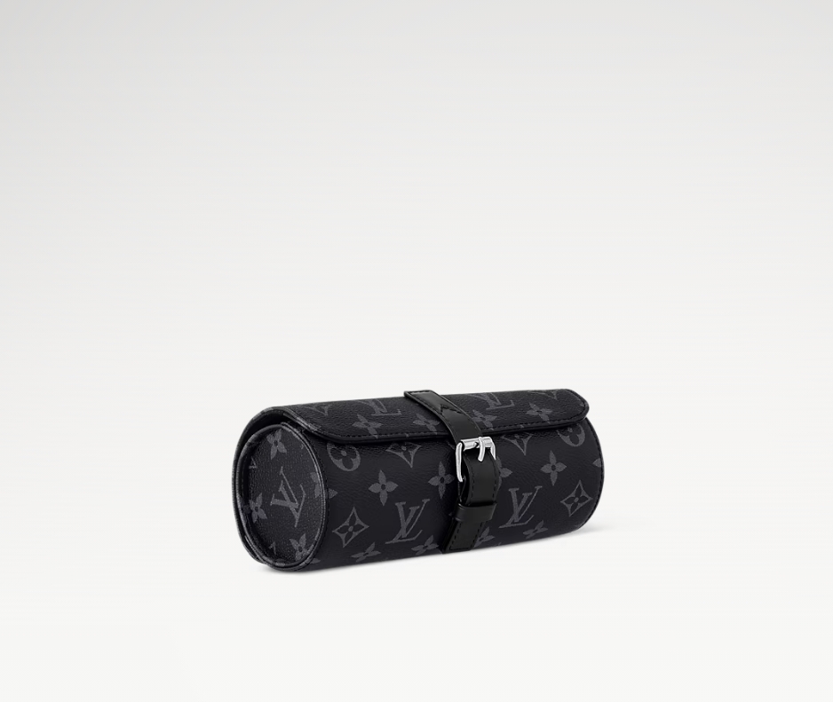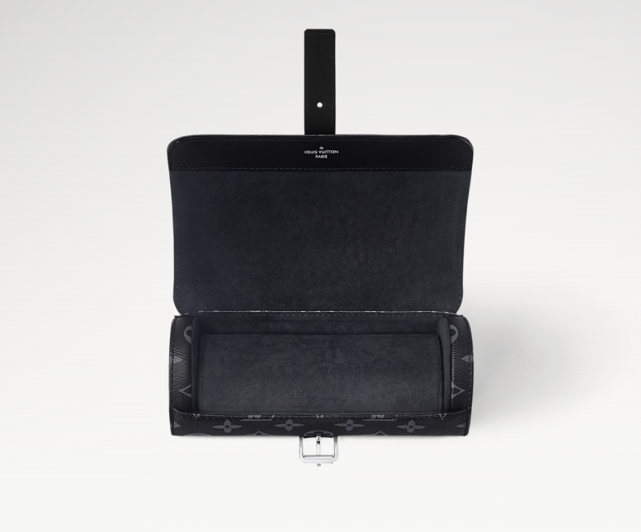 マスキュリンな印象のモノグラム・エクリプス キャンバスの内側に取り外し可能なクッションを施した「エテュイ・3 モントル」。ソフトなクッションが大切な時計を保護し、最大3本まで収納可能なウォッチケースです。バックル付きのレザーストラップでしっかり閉じることができ、安心して持ち運べます